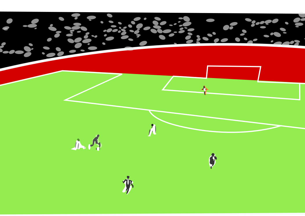 This is a colorful drawing of a soccer field with several players on it. There are at least nine people visible in the scene, some closer to the foreground and others further away. They appear to be engaged in a game or practice session. The soccer field itself has a red background, which contrasts nicely with the green grass where the players are standing. The drawing is detailed enough to show the players' positions on the field, indicating that they are actively participating in the sport. Overall, it is an artistic representation of a lively soccer game taking place on a well-maintained field.