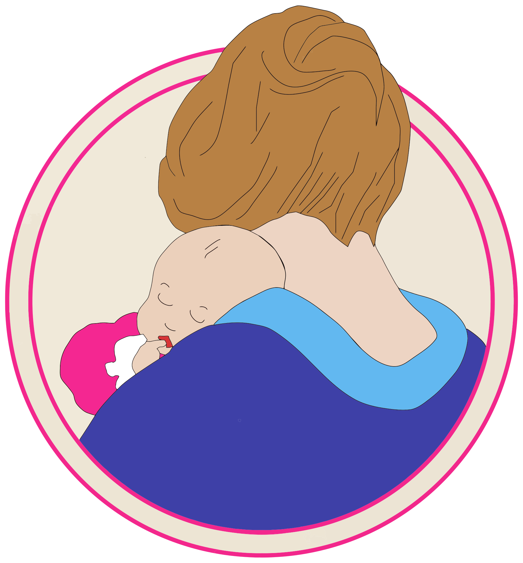 This features a woman holding her baby close to her chest, with the baby resting on her shoulder. They are both depicted in a pink and blue color scheme, which adds a touch of warmth and comfort to the scene. The woman's hair is styled in an updo, giving her a polished appearance. The illustration captures a tender moment between the mother and child, showcasing the bond they share.