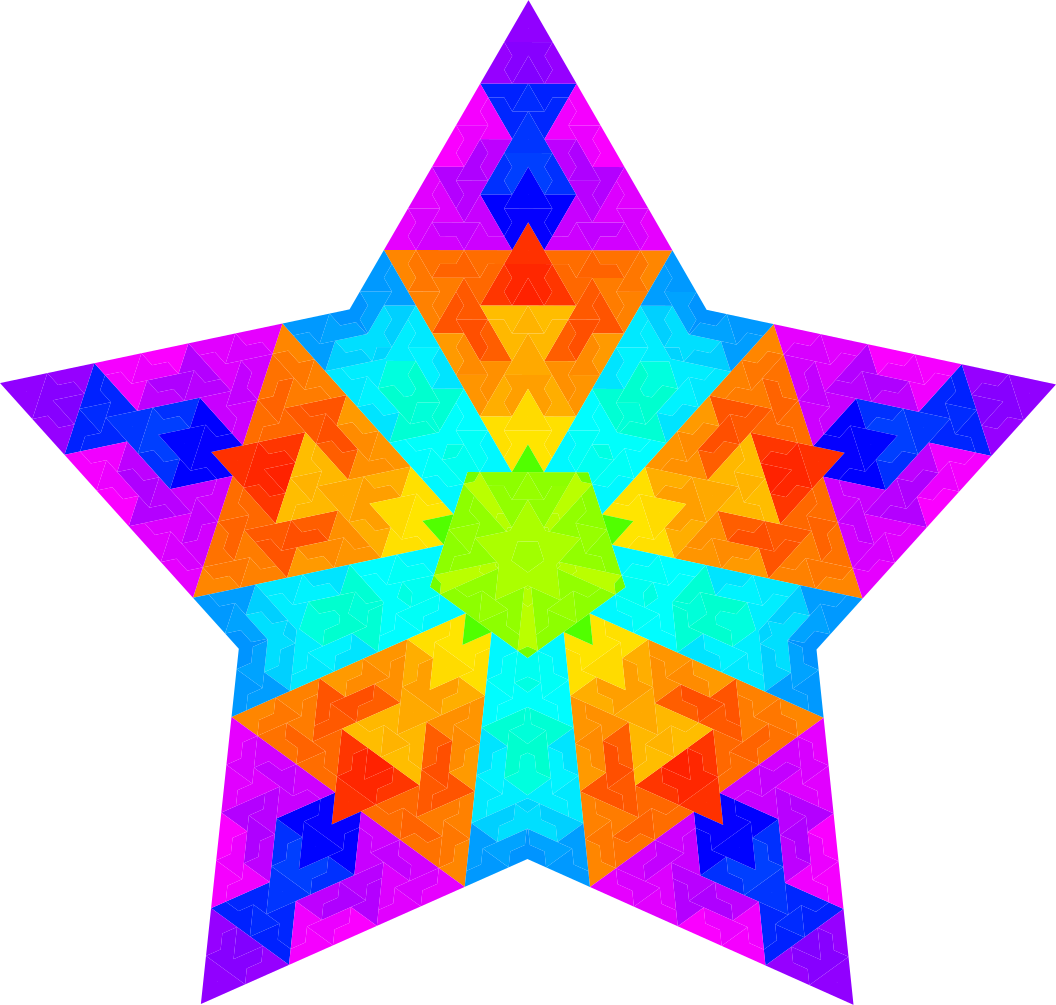 This features a large, colorful star with five points. Each point of the star is made up of triangles that are arranged in an intricate pattern. The star has bright colors and appears to be a part of a larger design or artwork. The combination of the vibrant colors and the geometric shape creates a visually appealing and eye-catching image.