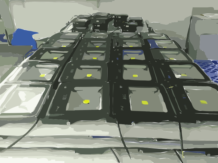 This features a large table filled with numerous electronic devices. These devices are arranged in rows, and they appear to be computer monitors or screens. There is an assortment of different sizes and shapes of the screens, creating a visually interesting display. The arrangement of these screens on the table suggests that this could be a factory or workspace where electronic components are manufactured or assembled.