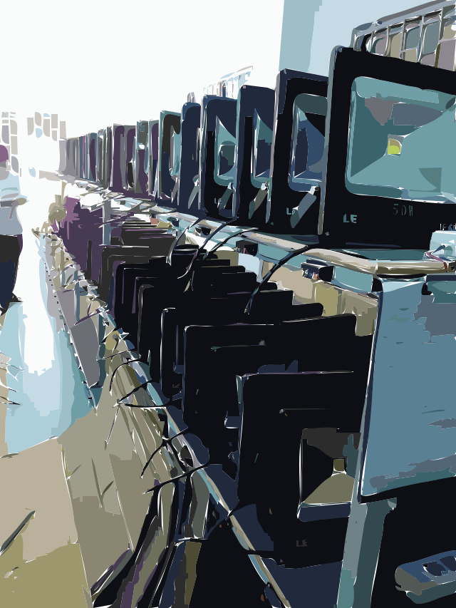 This features a factory with rows of televisions lined up on shelves. There are at least 13 TVs visible in the scene, all placed next to each other and varying in size. Some of these TVs have cords plugged into them, indicating that they might be undergoing testing or maintenance. The factory appears to specialize in producing electronic devices such as televisions, with a focus on quality and efficiency.