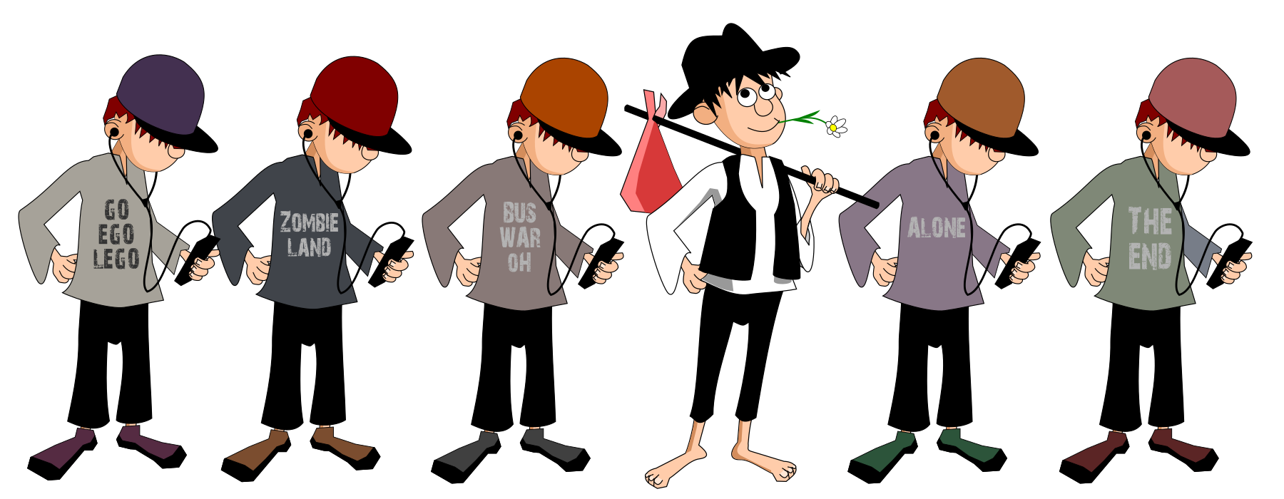 This features a group of five cartoon characters standing next to each other, all wearing different colored hats. They are positioned in such a way that they appear to be looking down at their cell phones. In the middle of this group is another character dressed as if he's traveling, possibly holding a backpack and a book. The scene gives off an impression of people gathered together but focused on their individual devices rather than engaging with one another.