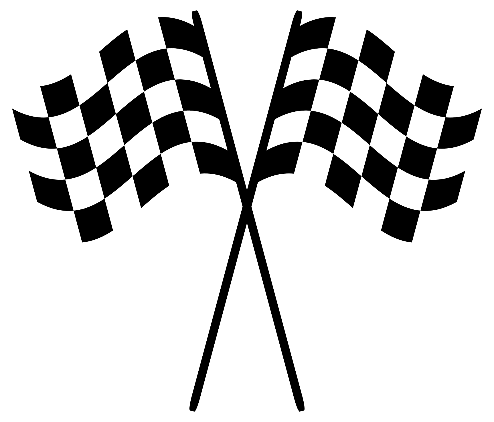 This features a black and white illustration of two checkered racing flags on flag poles. The flagpoles are crossed over one another at the bottom of the two flags, creating an interesting visual effect. The flags themselves have a checkered pattern, which is commonly associated with racing or sports events. This design element adds a sense of motion and excitement to the image, making it visually appealing and engaging for viewers.
