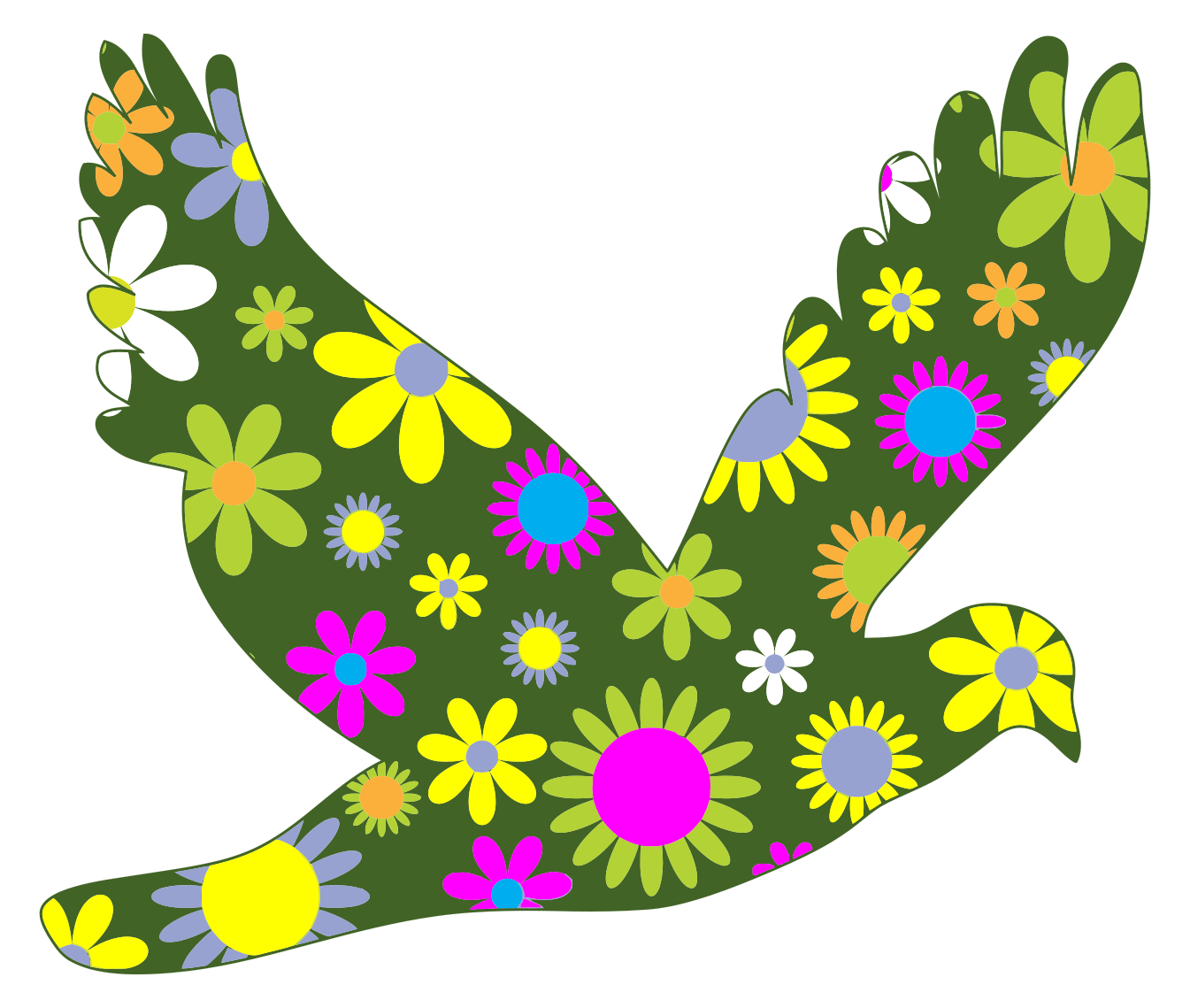 This features a colorful dove with its wings spread wide, flying through the sky. The dove's body is adorned with various flowers of different colors and sizes, creating an eye-catching pattern. These flowers are scattered all over the dove's body, from its head to its tail feathers. The combination of the vibrant colors and intricate flower patterns make this image a delightful and visually appealing representation of a bird in flight.