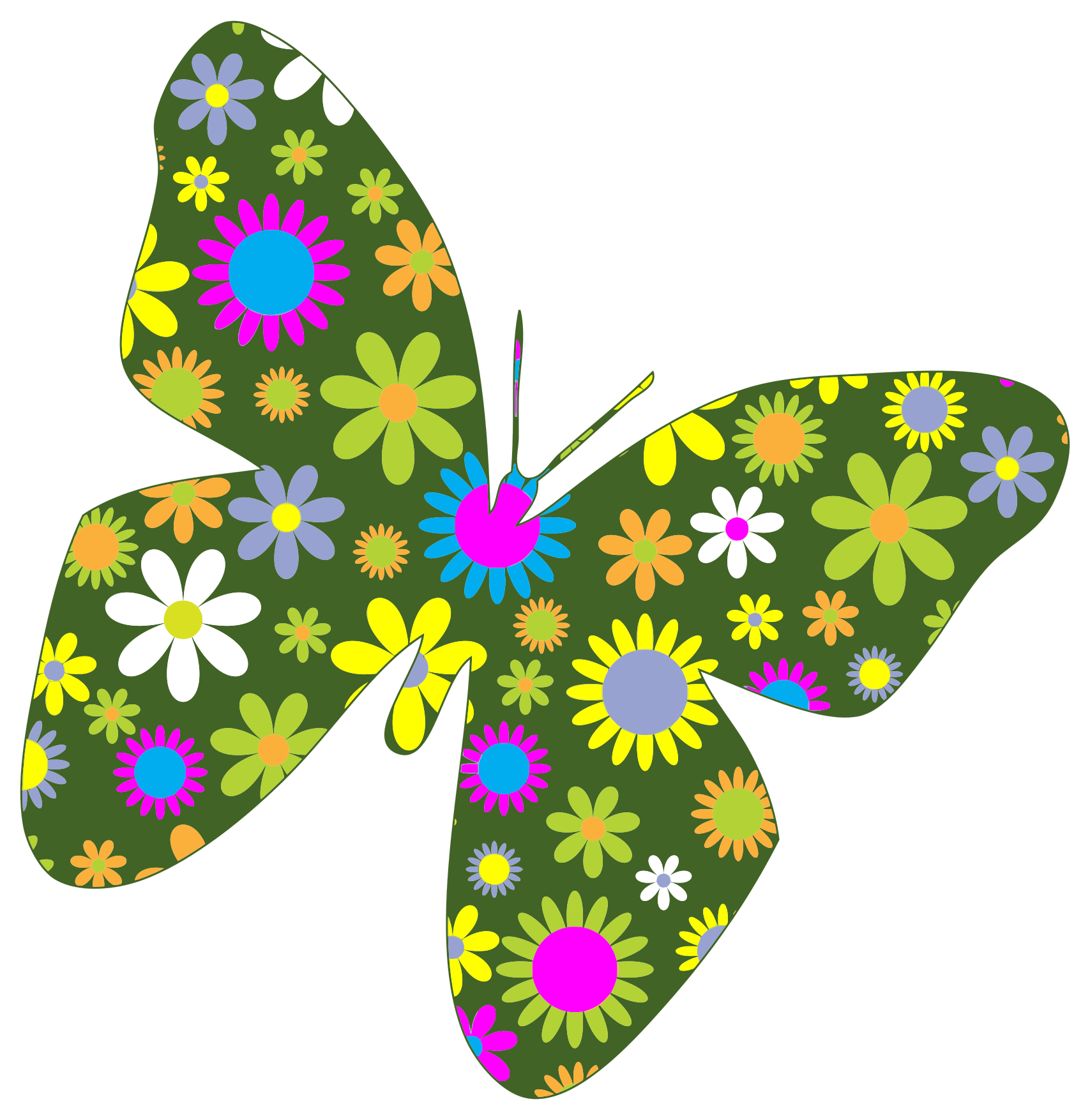 This features a butterfly with a green body and yellow wings. It is adorned with various colorful flowers, including daisies in different shades of pink, blue, and yellow. These flowers are scattered all over the butterfly's wings and body, creating an eye-catching and vibrant display. The overall effect is a lively and cheerful representation of nature's beauty.
