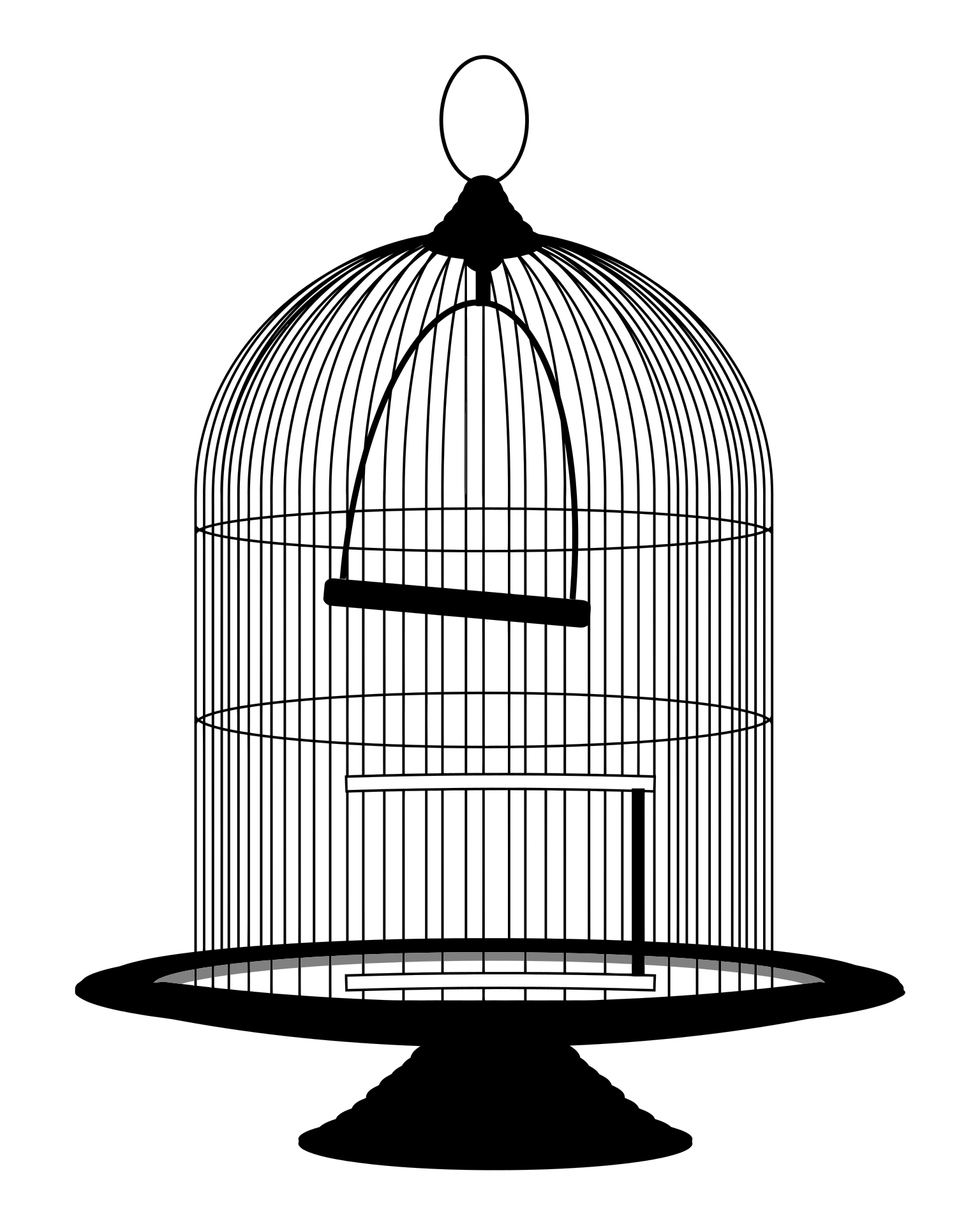 This features a black and white drawing of an empty birdcage. Inside the cage, there is a swing designed for birds to perch on. The cage itself is placed on top of a stand, which adds stability and elevation to the structure. This artistic representation of a birdcage showcases its unique design elements and captures the viewer's attention with its contrasting colors and intricate details.