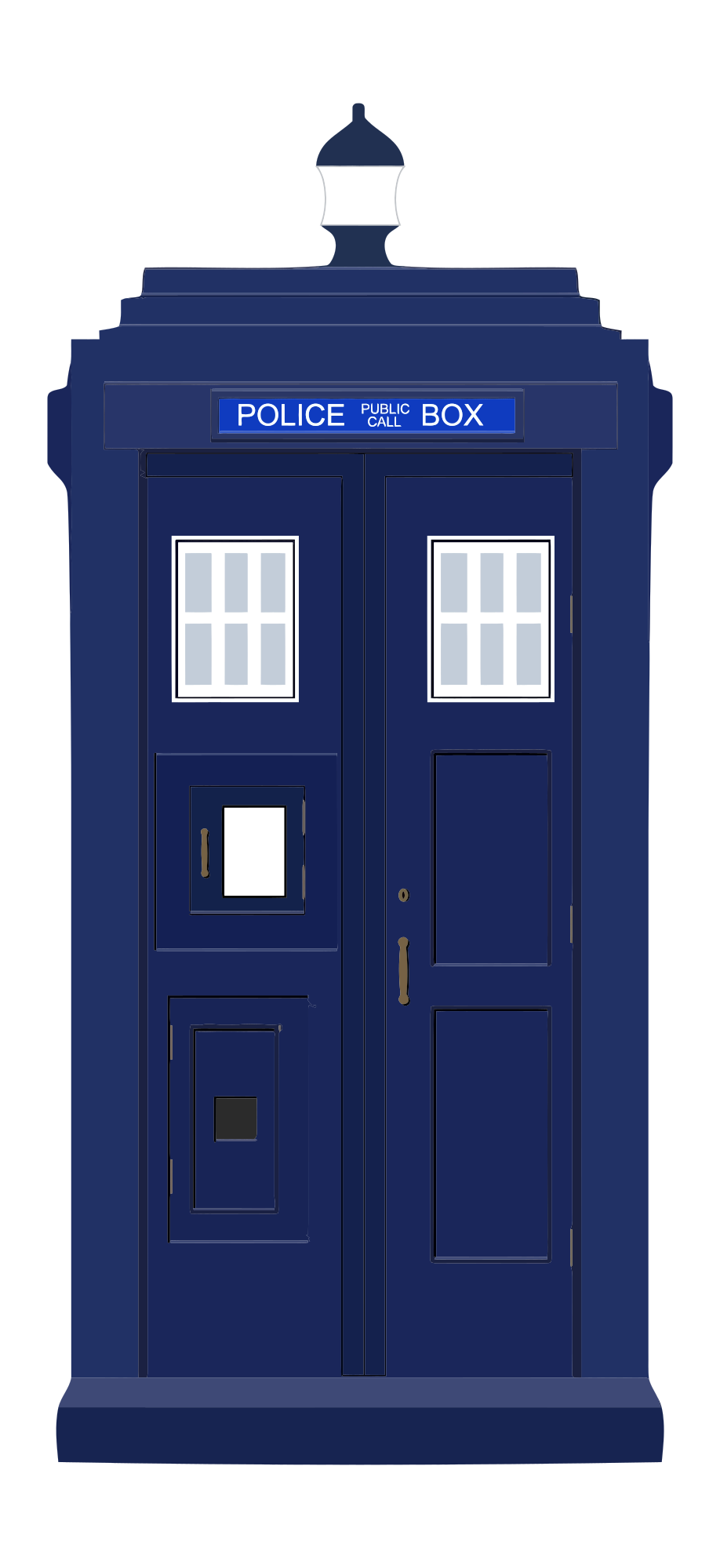 This features a blue police box, which is an iconic symbol from the popular television show "Doctor Who." This particular police box has a unique design with two windows on each side. It stands out against a white background, making it easily recognizable as a classic element of the show's universe. The police box serves as a reminder of the adventures and stories that have unfolded within its walls over the years, capturing the imagination of fans worldwide.