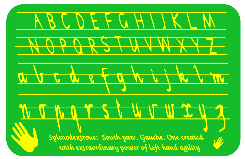 This features a green and yellow alphabet poster with the letters arranged in a grid. The poster is designed to help left-handed children learn how to write, making it an educational tool for young students. The colors of the poster are bright and eye-catching, which can make learning more engaging and enjoyable for kids. The poster also includes a hand symbol at the top, emphasizing its focus on helping left-handed individuals improve their writing skills.