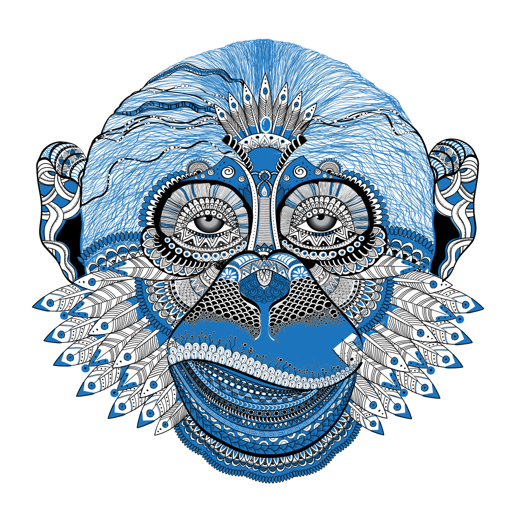 This features a blue and white monkey with an intricate design on its face. It appears to be wearing a necklace, adding to the artistic nature of the scene. The monkey's eyes are open, giving it a lively expression. The overall composition is visually appealing and captures the viewer's attention.
