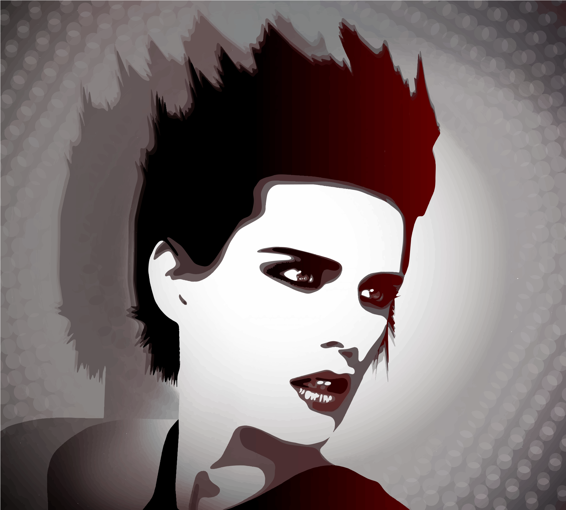 This features a woman with spiky hair and an intense stare. She has dark makeup on her face, which adds to the dramatic effect of her appearance. Her lips are painted red, and she appears to be wearing lipstick. The woman's eyes are open wide, giving off a sense of intensity or surprise. The image is in black and white, adding an artistic touch to the overall composition.