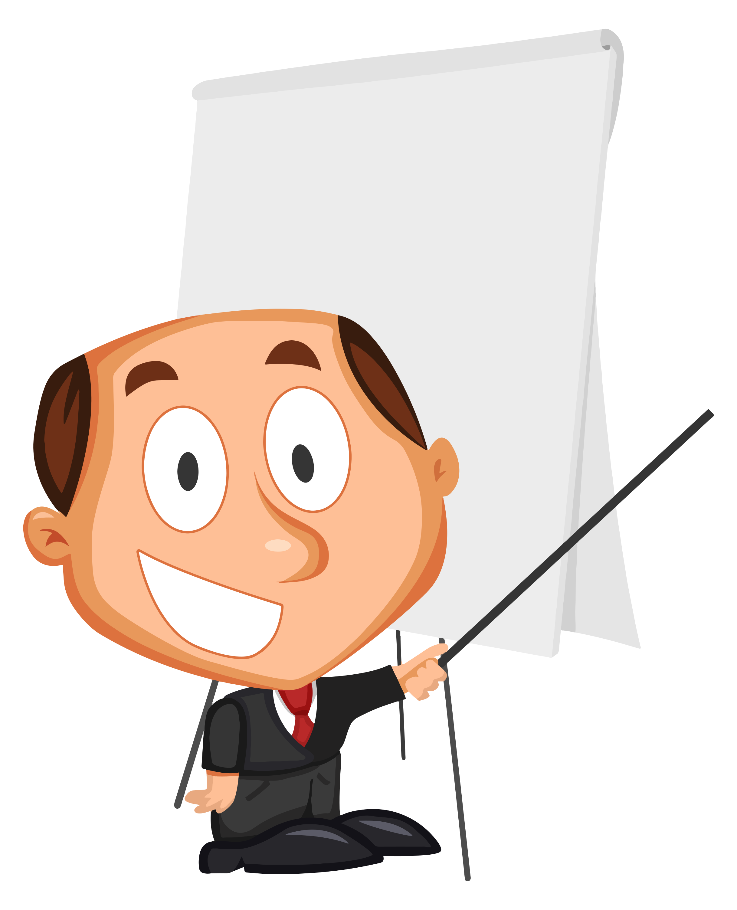 This features a cartoon illustration of a man in a suit and tie standing in front of a large notepad. He is holding a pointer in his hand, indicating that he is giving a presentation or lecture. The man appears to be smiling as he stands confidently with the board behind him. This whimsical depiction showcases the man's professional attire while maintaining a lighthearted and fun atmosphere.