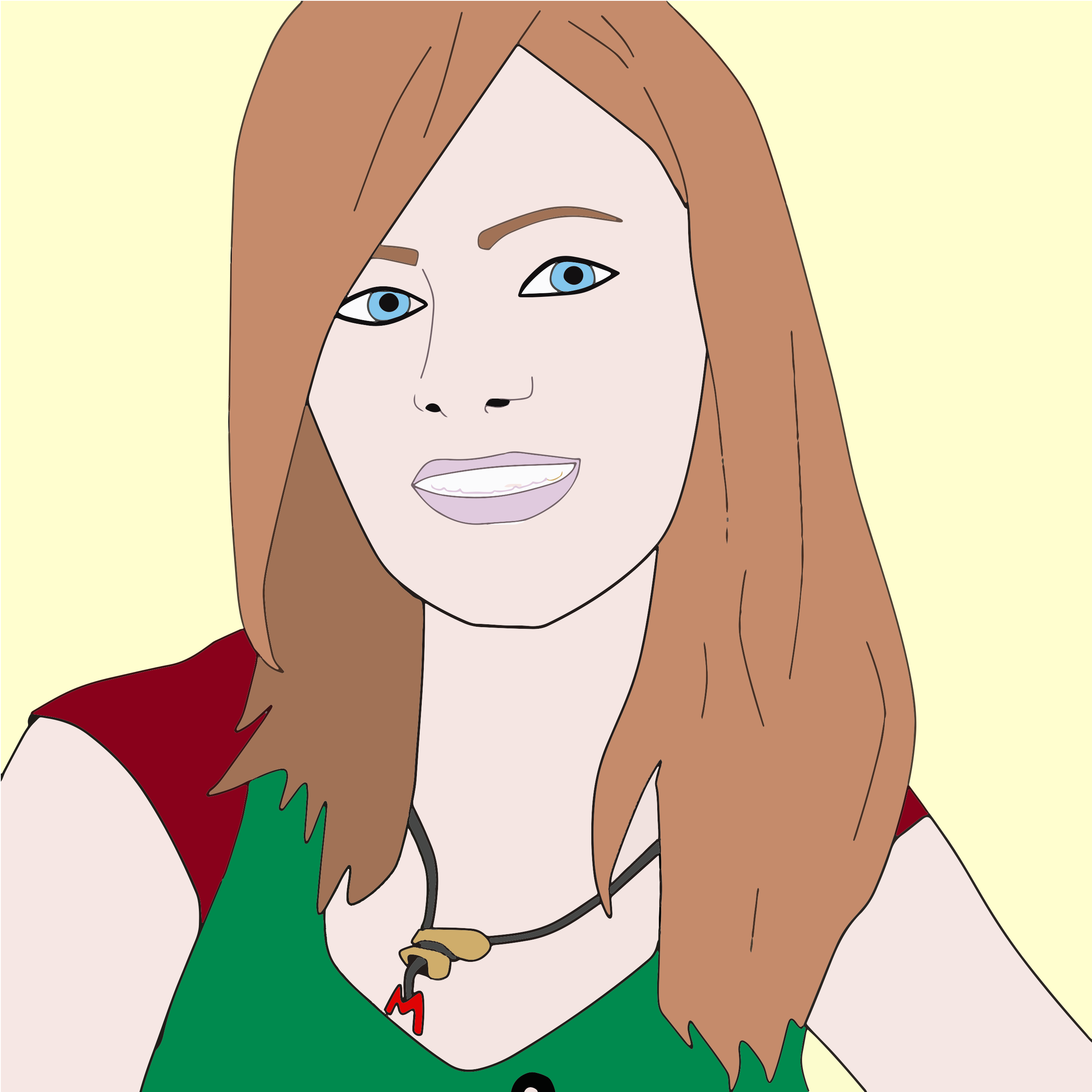 This features a woman with long, red hair and green eyes. She is wearing a necklace around her neck and has a smile on her face. Her hair appears to be styled in a ponytail. The woman's outfit consists of a green shirt and a red top, giving the impression that she might be dressed for a casual or relaxed occasion.