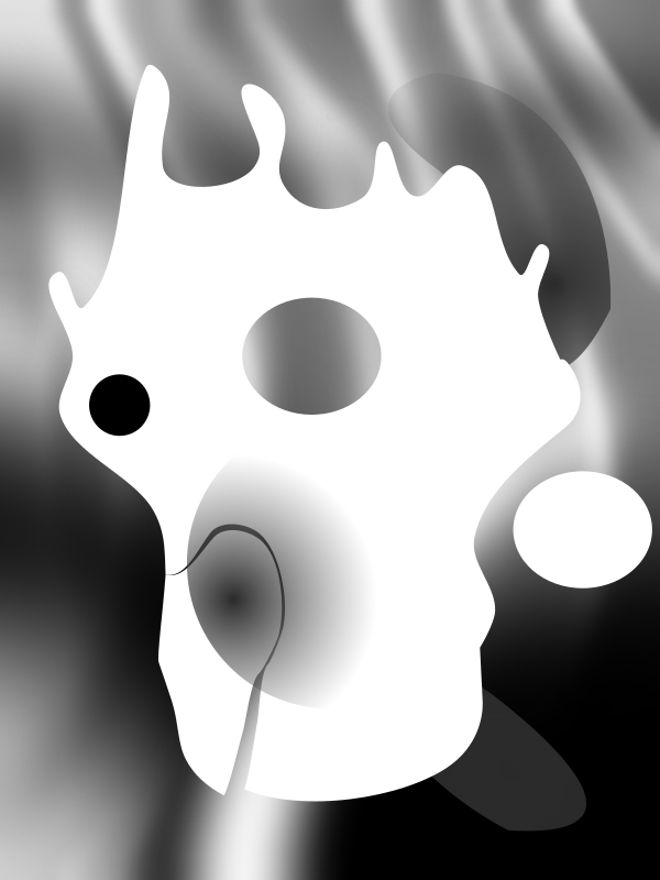 This features a white and black cartoon character with a large head, giving it an unusual appearance. It appears to be a close-up of the character's face, which is surrounded by a dark background. The character has two eyes, one on each side of its head, and a mouth in the center. Additionally, there are two small circles located near the top right corner of the image, possibly representing ears or other features of the cartoon character.