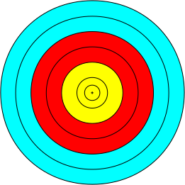 This features a large, colorful target with multiple concentric circles. The outermost circle is blue and the innermost one is red. In between these two colors are various other shades of blue, creating an eye-catching pattern. The target appears to be designed for darts or similar games, as it has a central bullseye surrounded by smaller rings. The entire image is filled with this vibrant and visually appealing design, making it an attractive focal point in the scene.