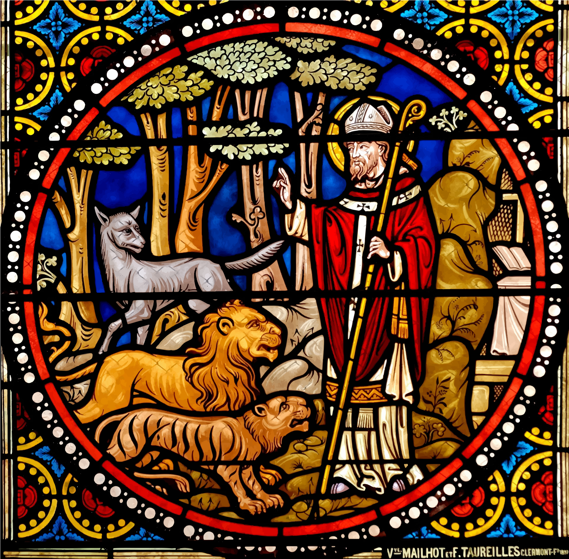 Tags: art, church, divine, glass, god, mural, religious, semi-realistic people, stained, window, stained glass, stained glass window, artistic, religiou, medieval, holy man, lion, tiger, dog, tree, forest, blue, green, yellow, red, orange