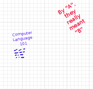 This features a whiteboard with several words written on it. One of the words is "Computer Language 101." There are also other words and numbers scattered across the board, such as "A," "by A they really mean G!" and "101." The writing appears to be in blue and red colors, making it visually appealing. The whiteboard seems to be a part of a classroom or educational setting where students can learn about computer language.