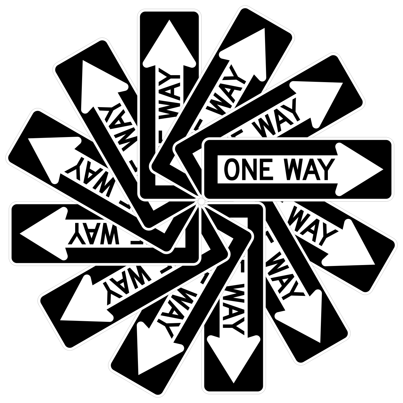 This features a large collection of one-way street signs arranged in a circular pattern. There are twelve individual signs, each displaying the word "one way" and pointing in different directions. These signs are positioned at various angles and heights, creating an intricate and visually engaging display. The arrangement of these signs creates a sense of depth and complexity, making it difficult to determine which direction is correct without closely examining each sign individually.
