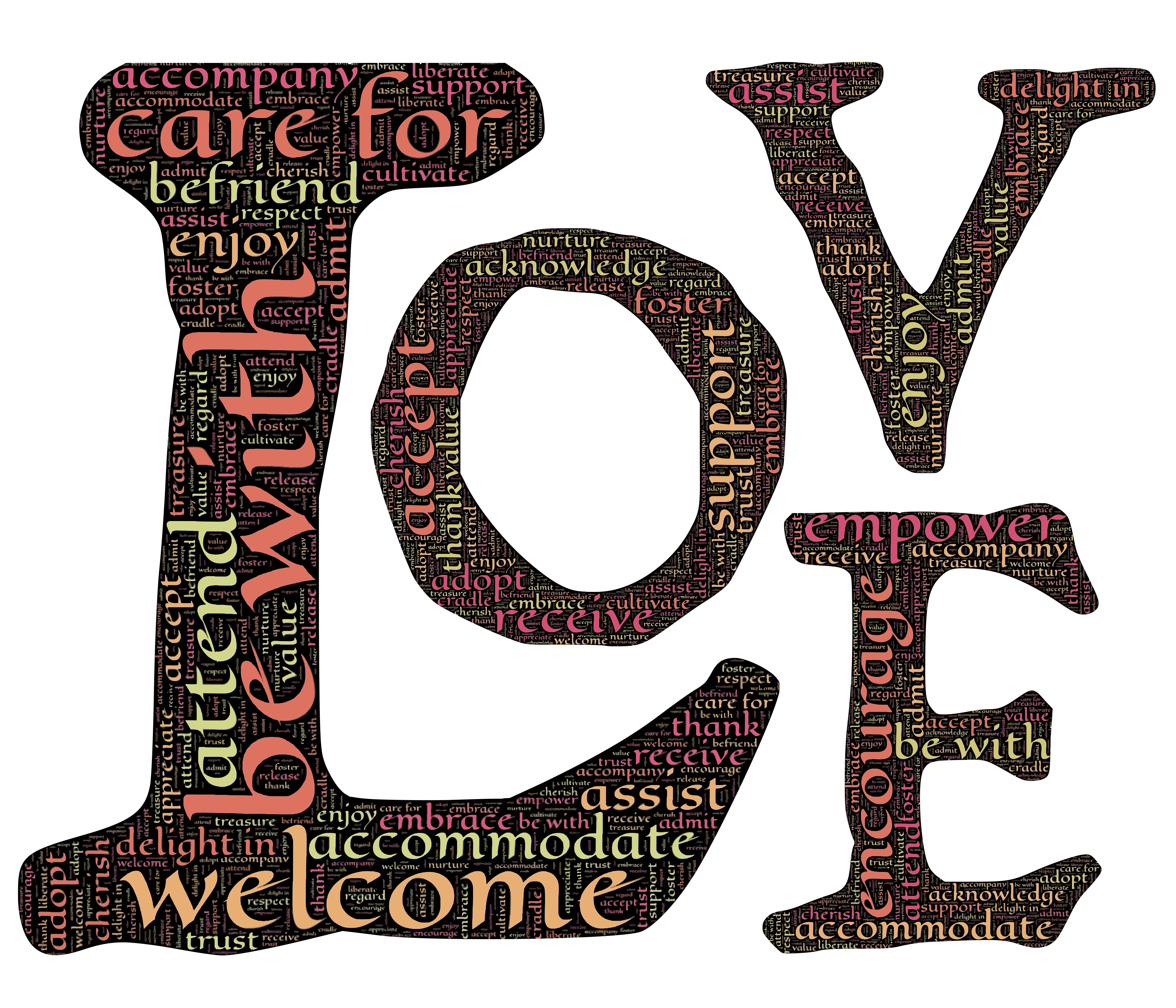This features a large, colorful word "love" made up of various other words. These words are arranged in a visually appealing manner to create the word "love." The individual letters that make up the word are scattered throughout the scene, with some appearing larger than others. This creative arrangement showcases the different meanings and aspects associated with love, making it an interesting and unique piece of typography.