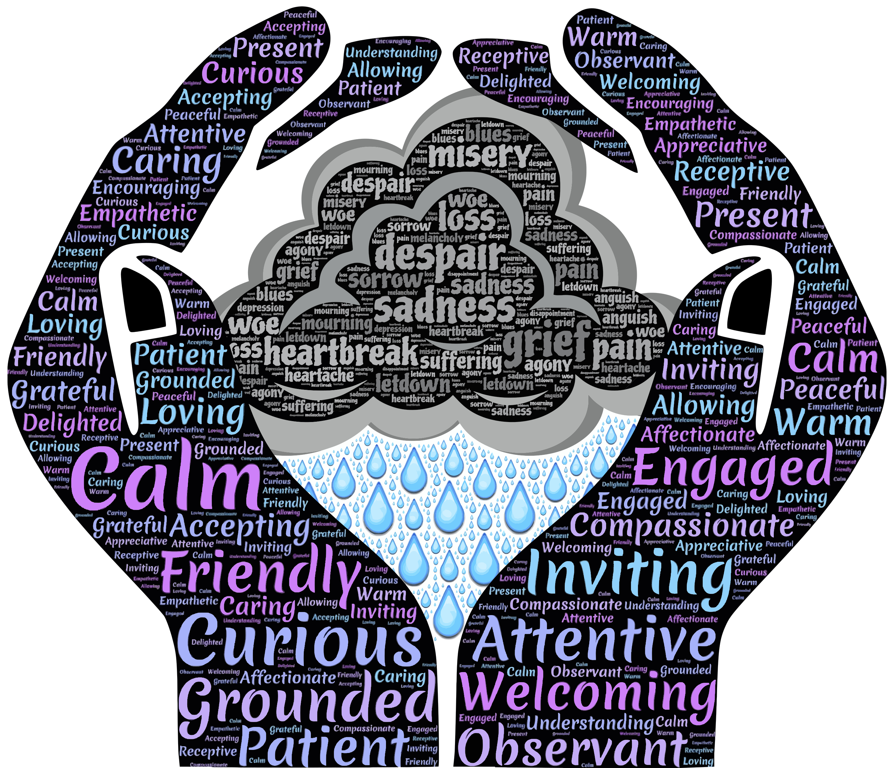 This features a unique and creative representation of two hands, each holding a cloud. One hand is filled with positive words in various shades of purple and blue, while the other hand holds a black cloud containing negative words written in different shades of purple and blue. The clouds are surrounded by raindrops, which add to the visual appeal of the image. This artistic display can be interpreted as an exploration of emotions or a commentary on the contrast between positive and negative experiences.