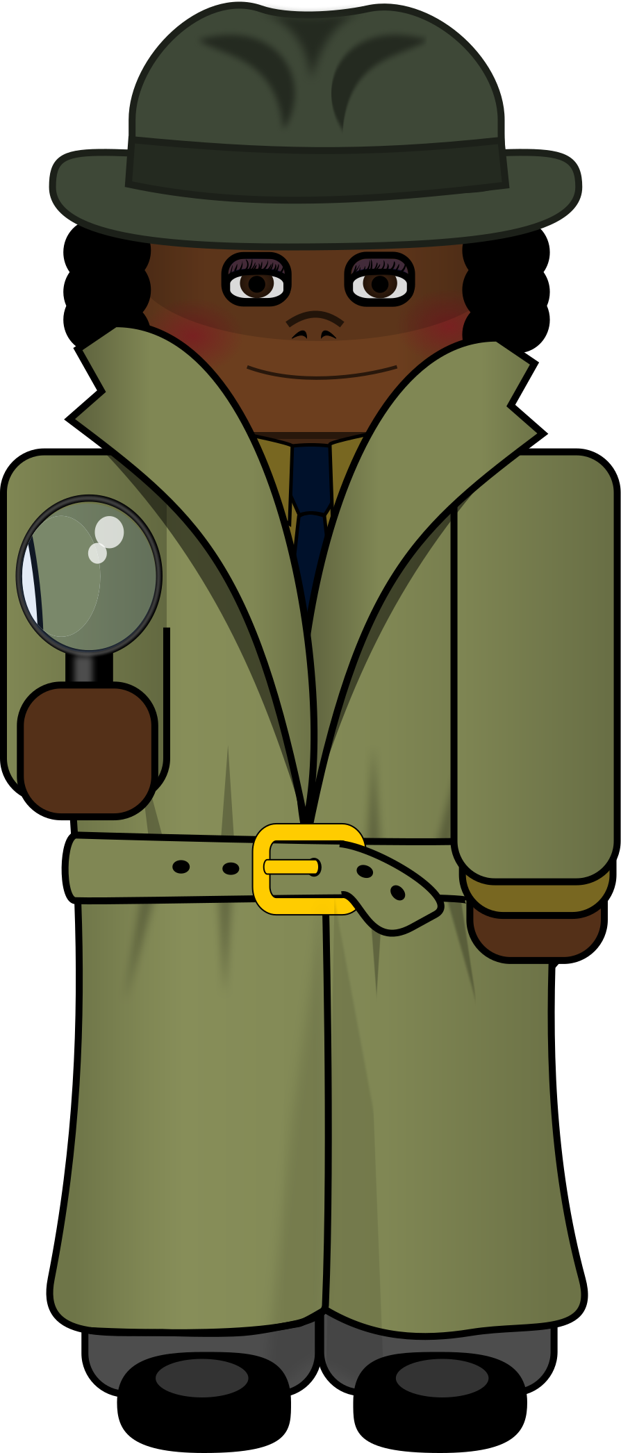 This features a cartoon character dressed in a brown coat and hat, holding a magnifying glass. This character appears to be an African American detective or investigator, possibly from the 1920s era. The outfit is reminiscent of classic detective stories, with the coat and hat being essential elements of the character's attire. The cartoon character stands in a room, capturing attention as it holds its magnifying glass, ready to solve any mysteries that may come its way.