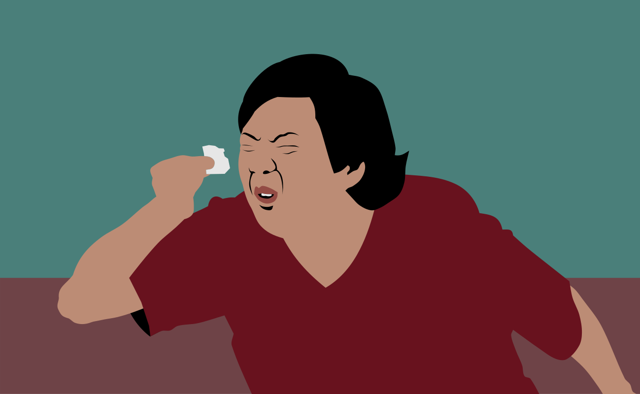 This features a man wearing a red shirt, with his hand up to his face. He appears to be making a funny or exaggerated expression as he holds a tissue in his mouth. This could possibly be an artistic representation of the character Ben Chang from the TV series "Community." The scene is set against a green background that adds a unique touch to the overall composition.