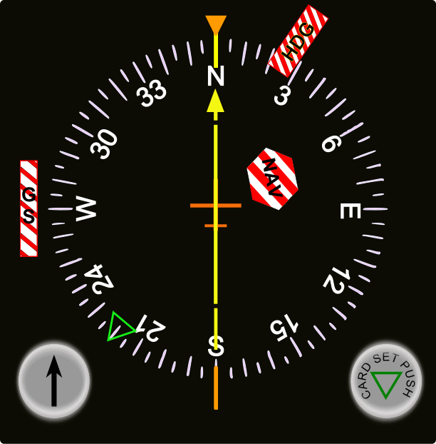 This displays a black and white navigational instrument that combines the aircraft heading with the VOR or ILS course. This instrument is designed to help pilots maintain situational awareness during their flights, as it provides essential information about the direction of travel, magnetic north, and other relevant data. The device features a compass at its center, which indicates the current heading of the aircraft. Additionally, there are several dials surrounding the compass that display various pieces of information such as degrees, cardinal directions (North, South, East, West), and even the distance to specific locations. This combination of elements makes it an invaluable tool for pilots navigating through different terrains and weather conditions.