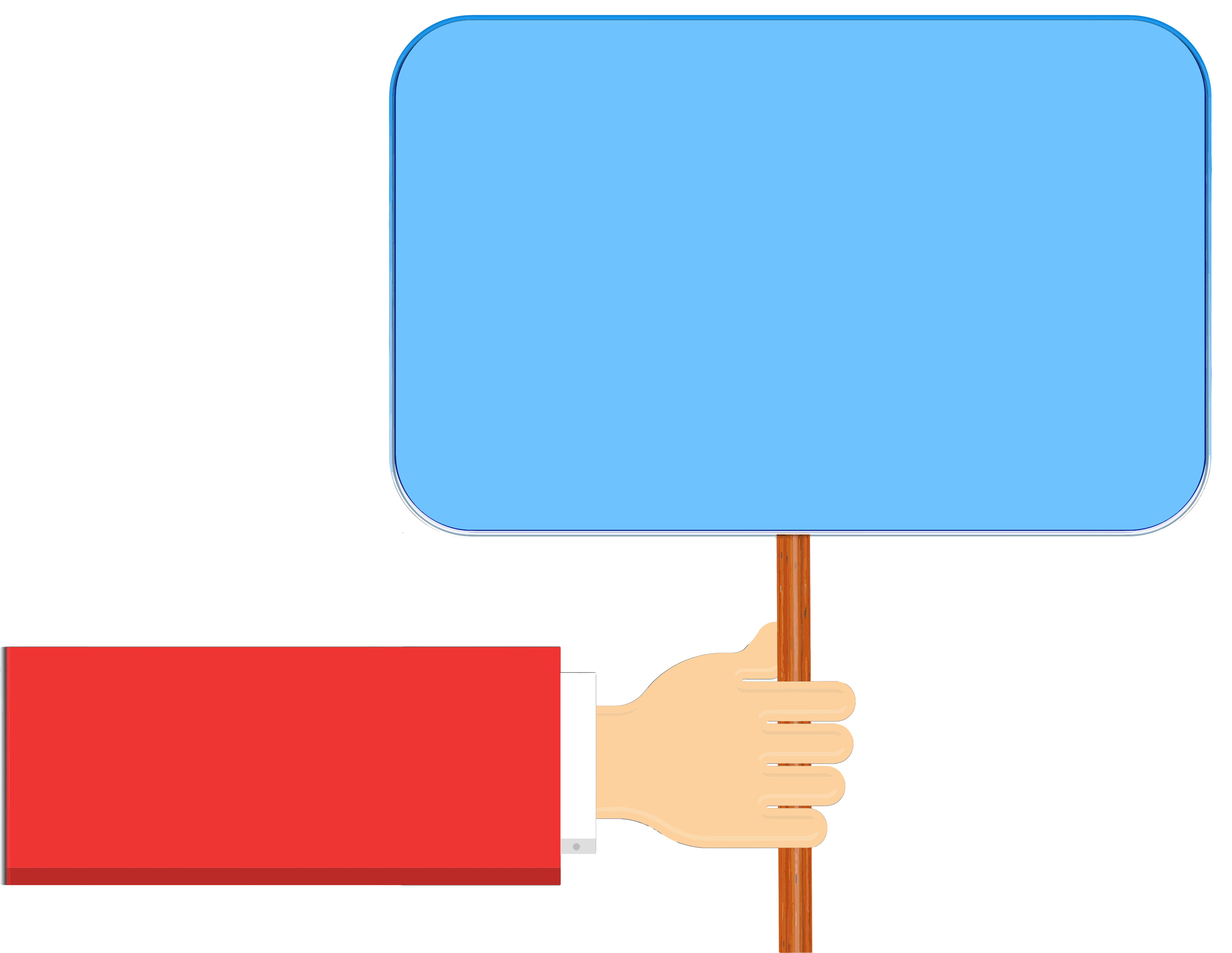 This features a hand holding up a blue sign, which is attached to a wooden stick. The hand appears to be positioned in the center of the scene, with the sign and stick extending outwards from it. The blue color of the sign contrasts nicely against the white background, making it stand out prominently. This image could represent various scenarios such as an advertisement or a warning sign, depending on the context in which it is used.