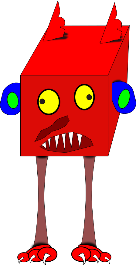 This features a red robot with blue eyes and yellow dots, standing on two red feet. It has a menacing appearance as it stares at the viewer. The robot's face is adorned with a mouth that appears to be open, giving it an evil look. Its body is made up of a box-like structure, adding to its unique and intriguing design.