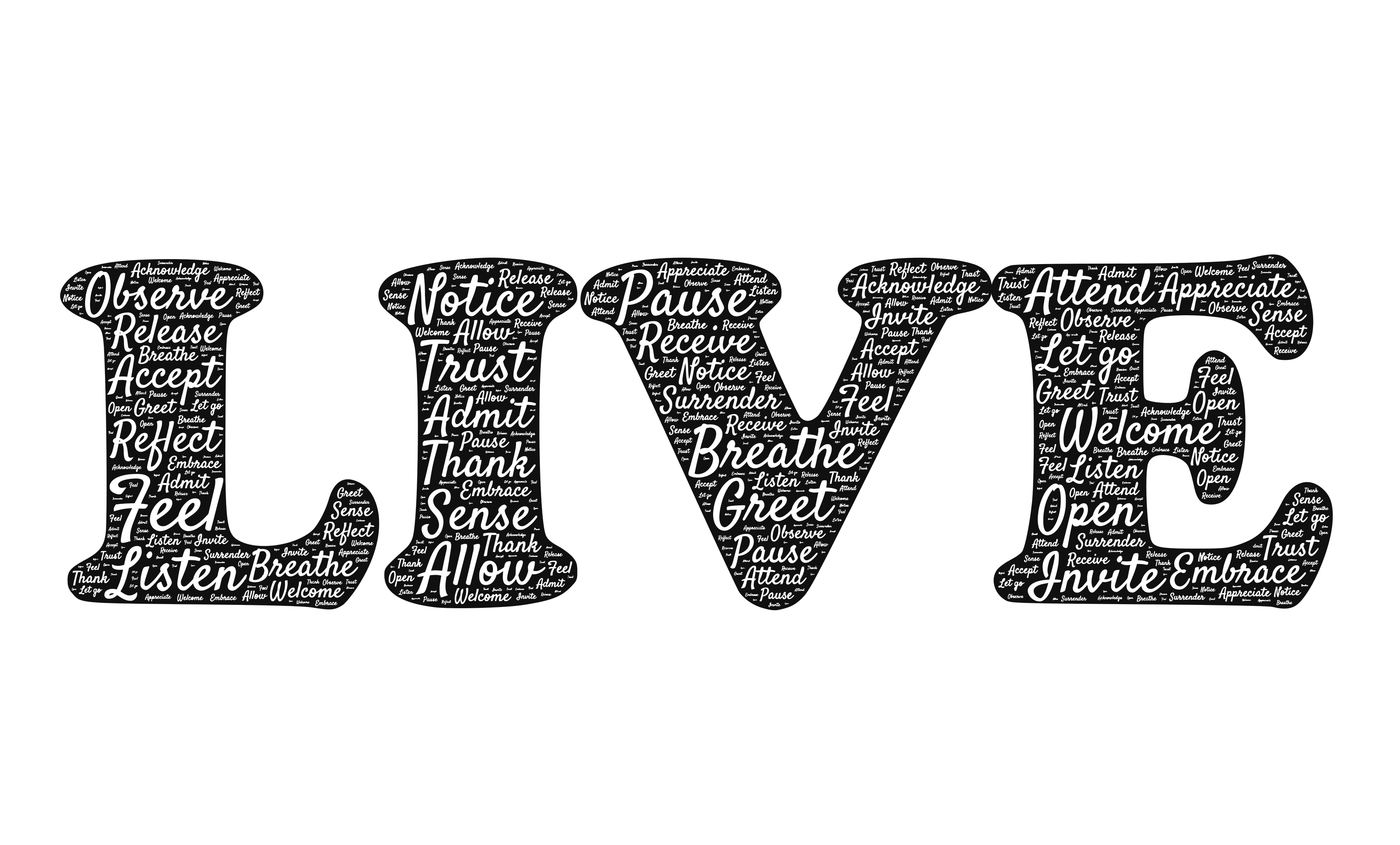 This features a large white word "Live" written in various fonts and sizes. The word is surrounded by numerous other words, creating an interesting visual effect. Some of the surrounding words include "voice," "pause," "breathe," "dream," "listen," "believe," "love," and many more. The combination of these words creates a unique and intriguing display that captures attention.