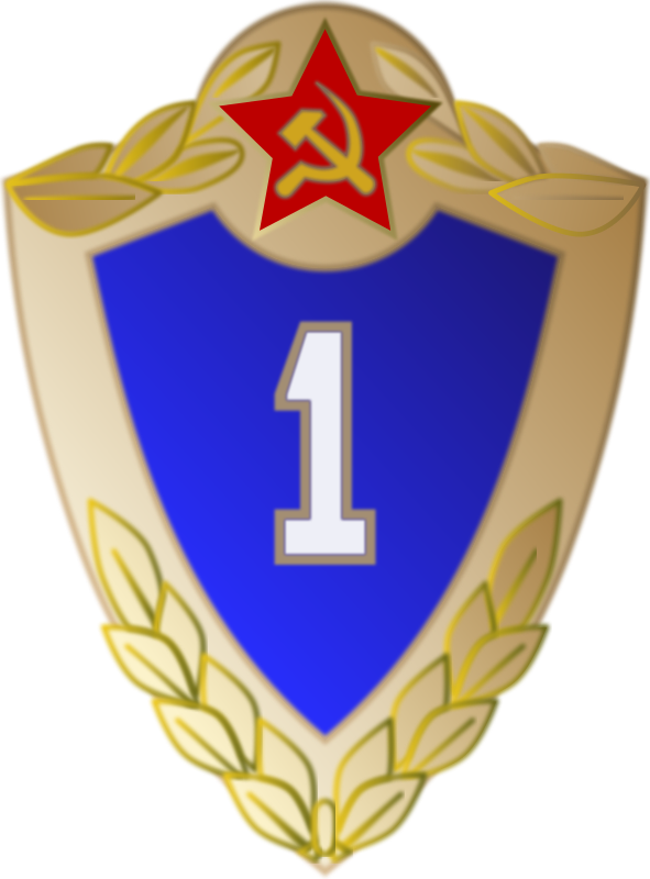 This features a blue and gold medal with the number one on it. The medal is adorned with a red star, which is a symbol of communism. This award appears to be a decorative piece or a trophy, possibly representing an achievement or recognition in some context. The combination of colors and symbols gives the medal a distinctive appearance that stands out against its background.