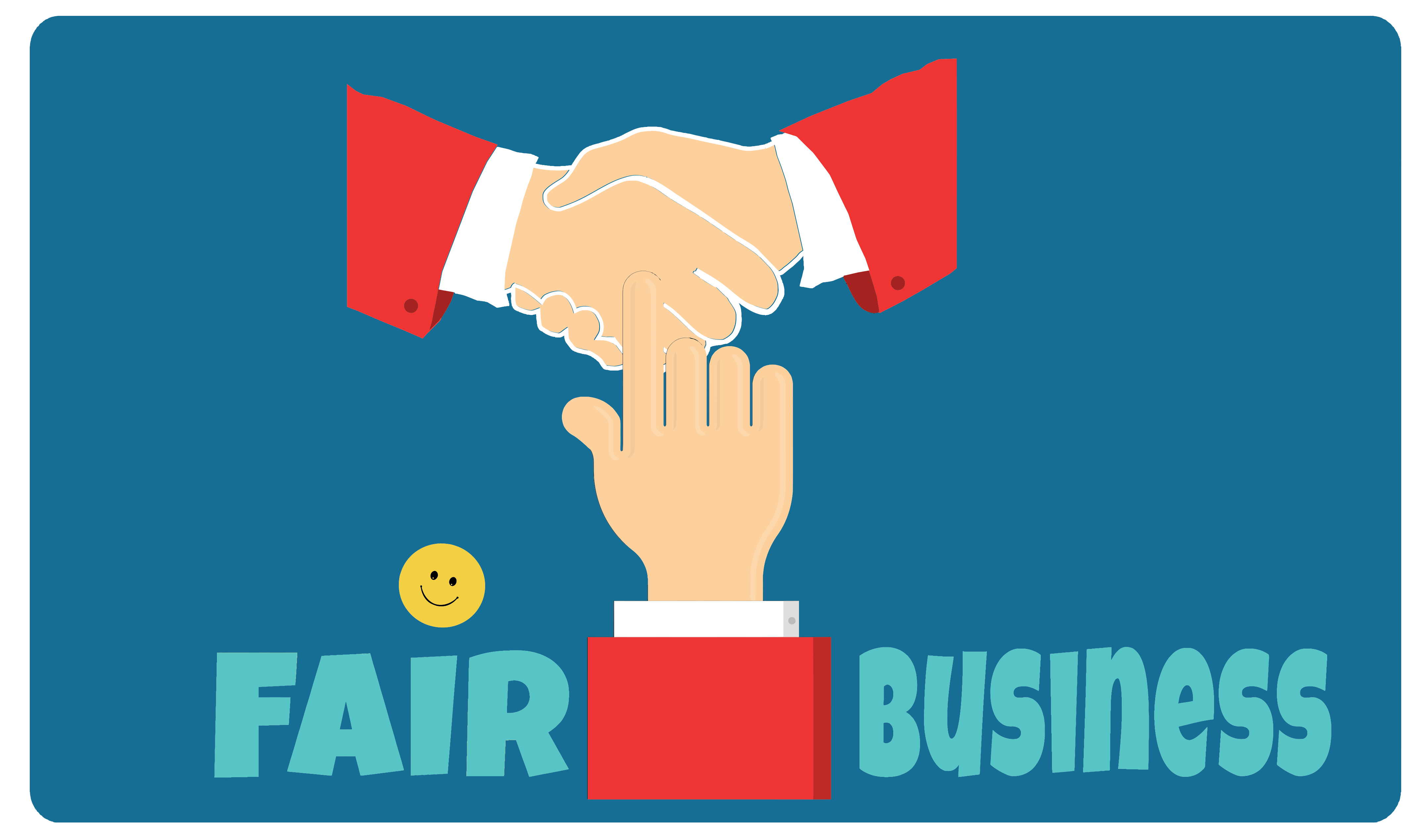 This features a logo for fair business, with two hands shaking and the third hand reaching out to join them. This illustration is set against a blue background, giving it a clean and professional appearance. The hands are positioned in such a way that they appear to be holding a coin, which adds an element of trust and reliability to the logo. Overall, this image effectively conveys the idea of fair business through its visual representation of cooperation and agreement.