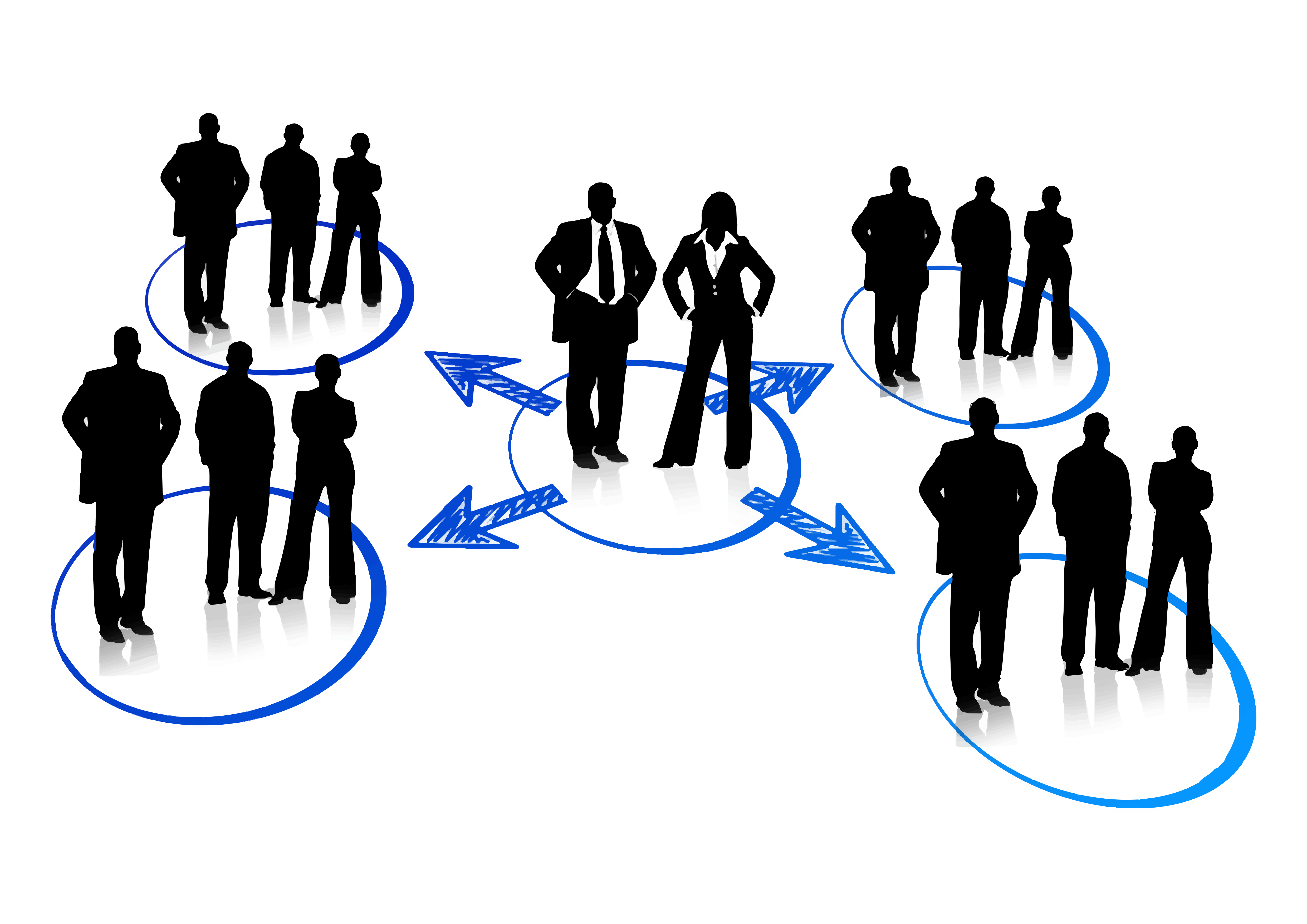 This features a group of people standing in various positions, with some of them wearing suits. They are all connected to each other through arrows that point towards the different individuals. There is a total of 13 people visible in the scene, and they appear to be engaged in conversation or interacting with one another. The image also features several blue circles surrounding the people, which may represent connections between them. In the center of the image, there are two people dressed in suits, surrounded by other individuals who seem to be part of a larger group.