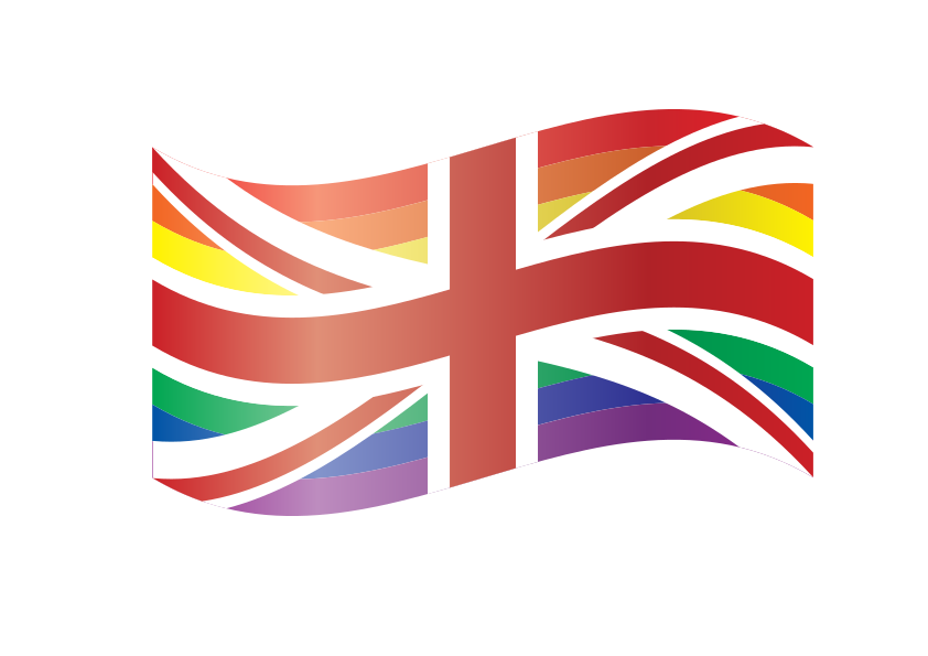 This features a large, colorful British flag with red and rainbow colors. It is waving in the wind, giving it an animated appearance. The flag is rectangular in shape, making it easy to recognize as a symbol of national pride. The vibrant colors and design make this flag stand out and represent the country's unique identity.