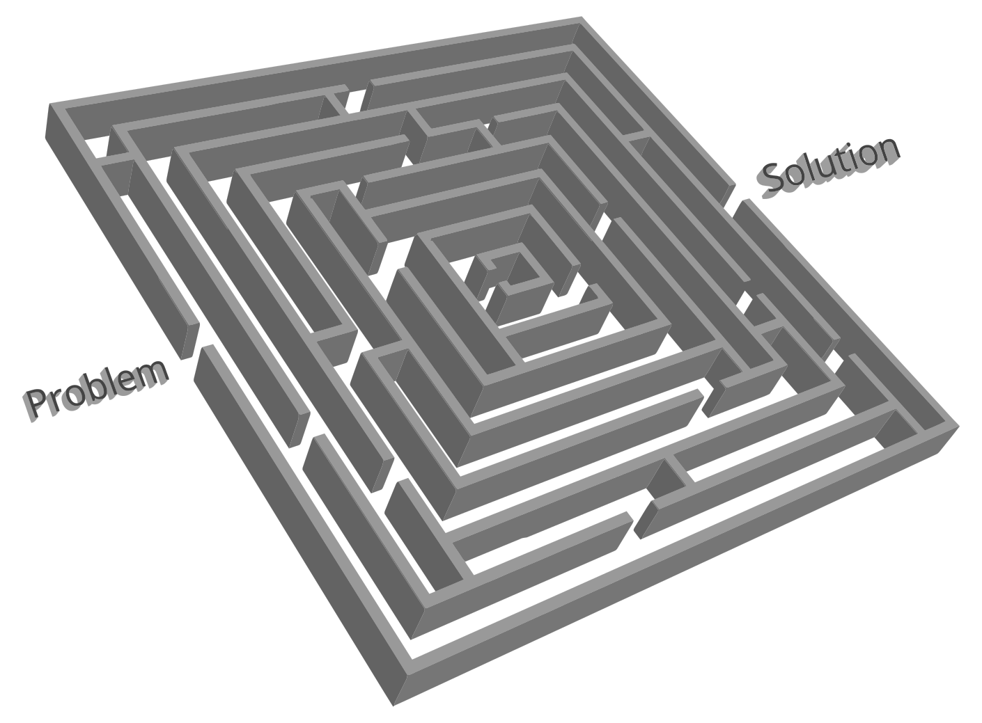 This features a three-dimensional maze with an entrance labeled "Problem" and an exit labeled "Solution." The maze is made up of various interconnected rooms, creating a complex and intricate design. The walls are gray in color, giving the maze a sleek appearance. The maze has a 3D layout, making it visually appealing and challenging to navigate through.