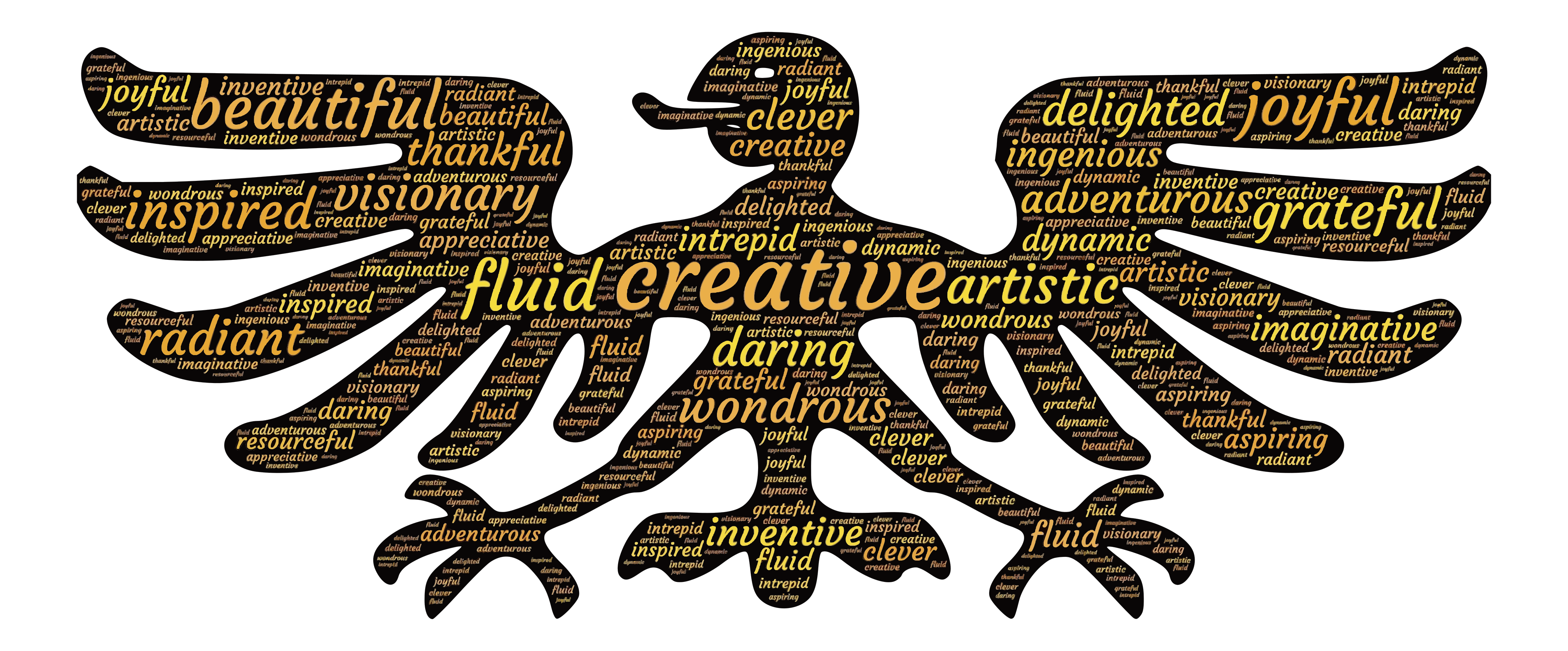 This features a beautifully crafted bird with wings spread wide, showcasing its artistic design. The bird is adorned with various words and phrases that are written in yellow, creating an eye-catching visual effect. These words seem to be related to creativity, as they are arranged around the bird's body, emphasizing its connection to this theme. Overall, the image presents a unique and captivating piece of artwork that combines both nature and language.