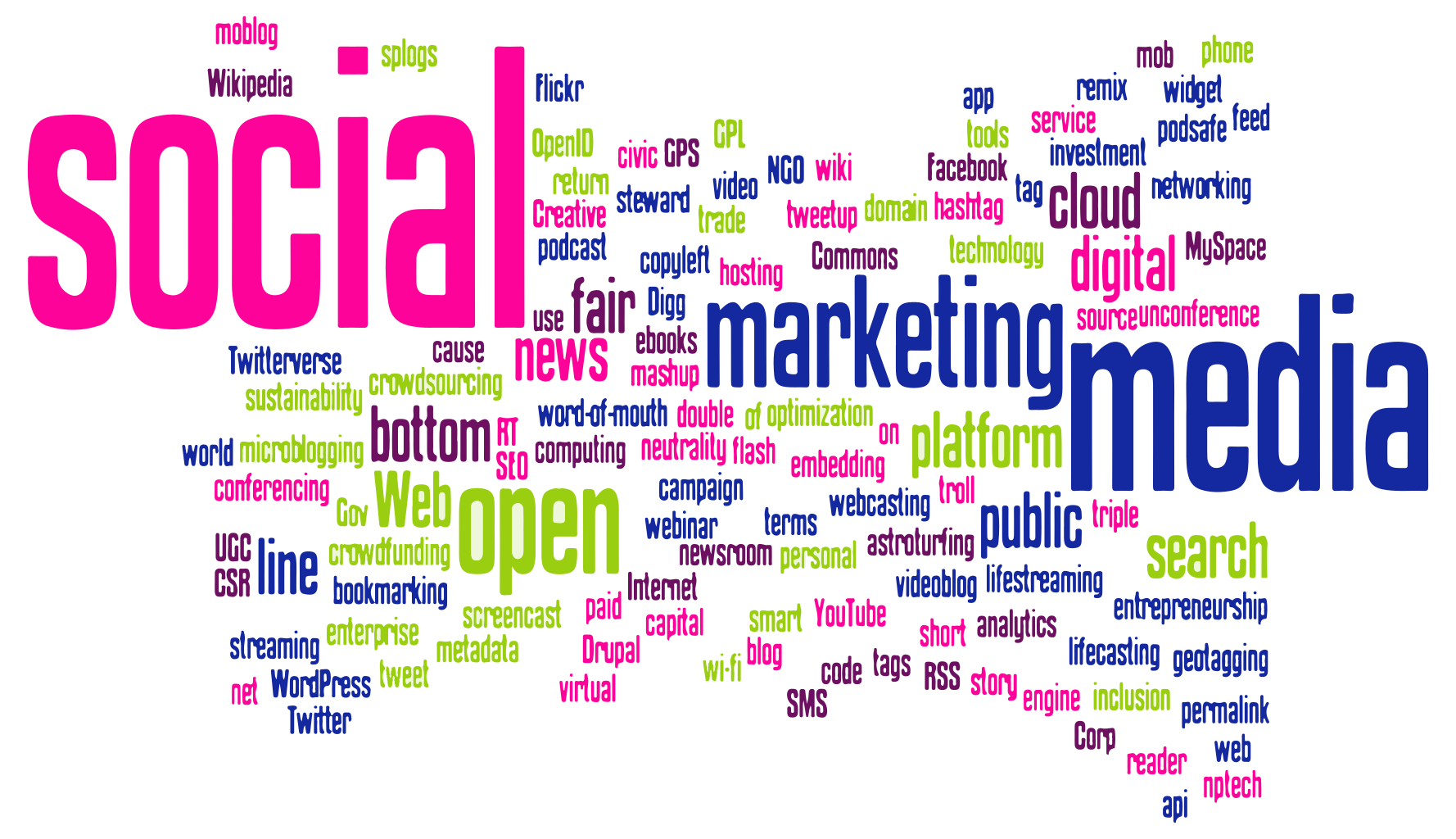 This is a word cloud of various social media terms. These words are written in different colors, making the image visually appealing and easy to read. The terms include "social," "media," "marketing," "digital," "networking," "cloud," "search," "engine," "blogging," "sales," "content," "creative," "technology," "web," "open," "public," "platform," and many more. The words are arranged in a way that they fill the entire image, creating a sense of depth and dimension. This word cloud effectively captures the essence of social media by showcasing its various components and aspects.