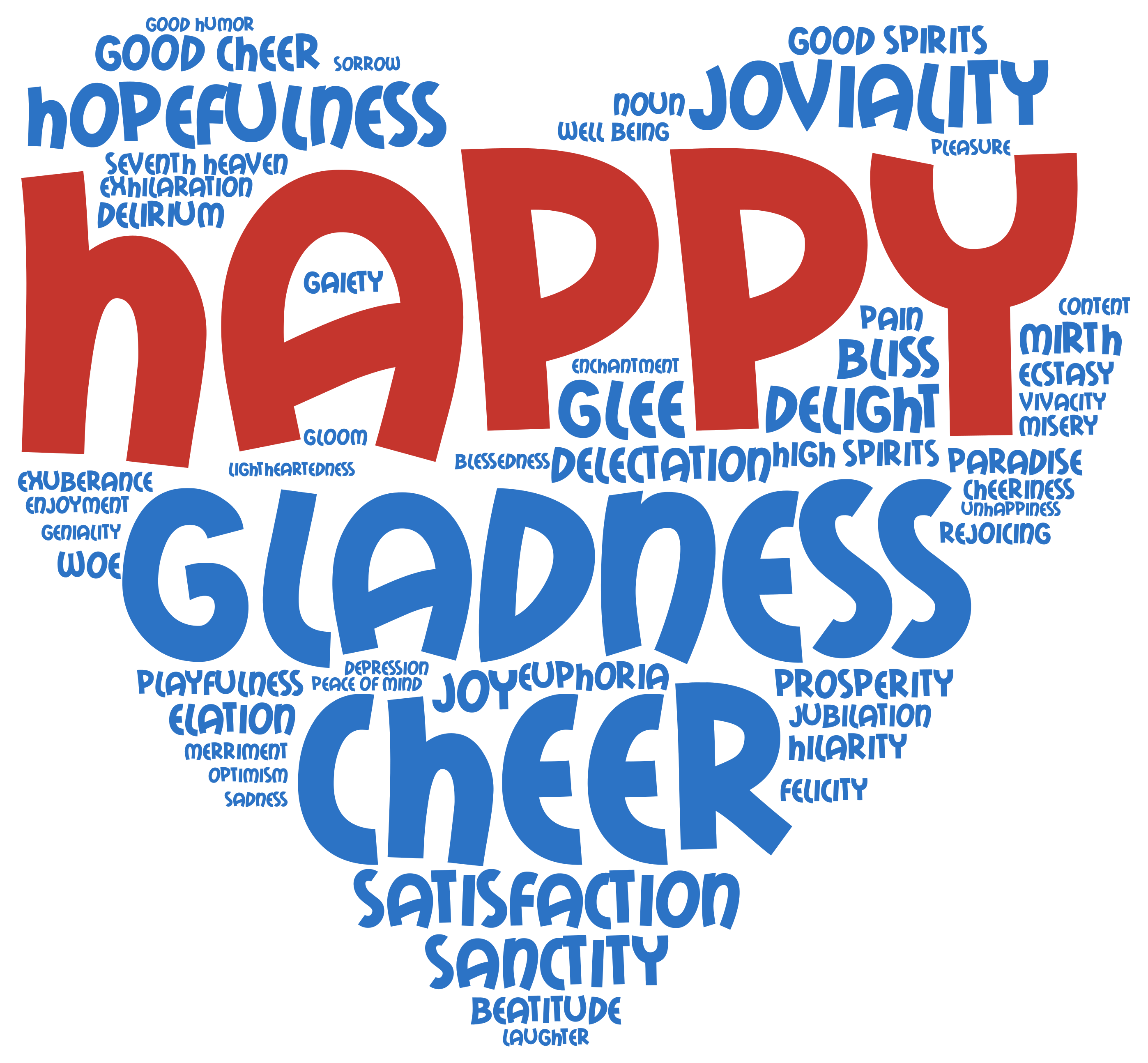 This is a word cloud made up of various positive words, including "Happy," "Gladness," and "Cheer." These words are written in different colors, with the word "Happy" being displayed prominently in red. The other words are scattered throughout the cloud, creating an overall sense of positivity and joy. This type of visual representation is often used to convey a message or evoke emotions related to happiness and well-being.