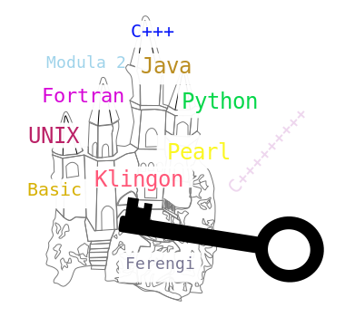 This is a colorful diagram featuring various computer languages. These languages are represented by different colors, making the chart visually appealing and easy to understand. In addition to the colors, there is a black key prominently placed in the center of the chart, which adds an interesting element to the overall design. This unique combination of colors and the key creates an engaging visual representation of computer languages for viewers.