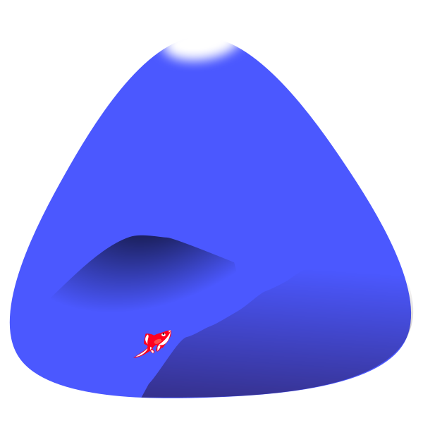 This features a small red fish standing on the edge of a large blue mountain. The fish appears to be looking down from its perch atop the mountain, creating an interesting contrast between the vibrant red color of the fish and the vastness of the blue mountain in the background. This unique scene is likely part of a creative illustration or artwork that captures the viewer's attention with its unconventional combination of elements.
