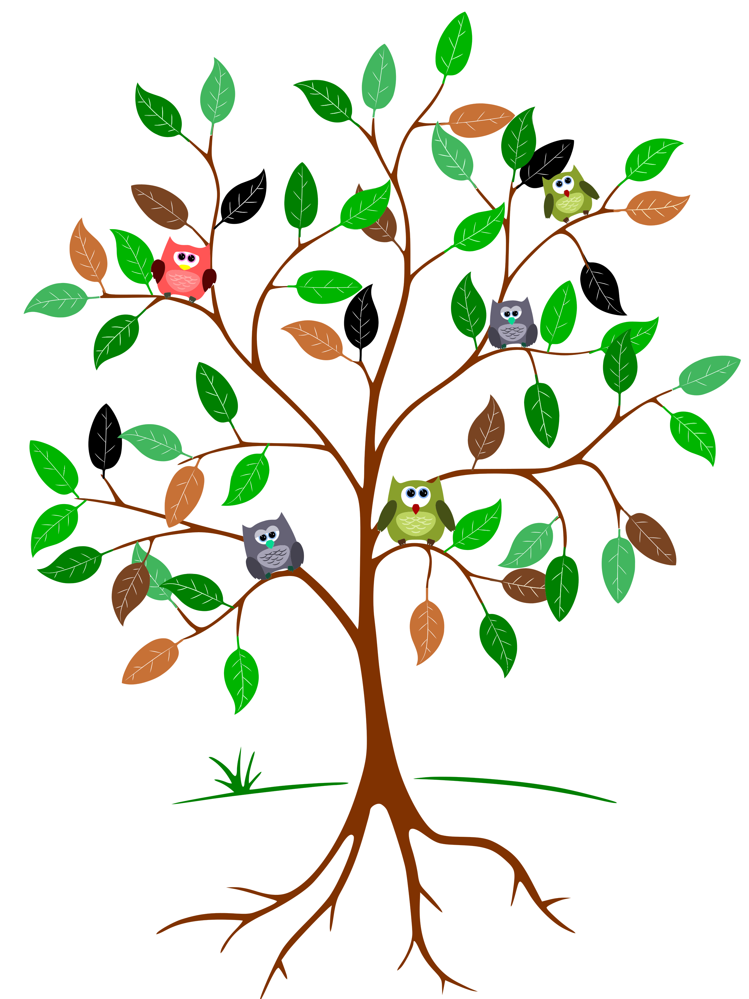 This features a tree with several small owls perched on its branches. There are five birds in total, each sitting at different heights and positions on the tree. The owls appear to be enjoying their time together as they rest on the tree's limbs. The tree itself is adorned with green leaves that provide a natural backdrop for these charming little creatures.