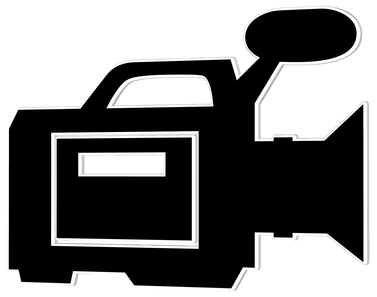 This features a black and white sticker of a video camera. It is an iconic representation of a filming device, with the camera's lens prominently displayed in the center. The microphone attached to the camera is also clearly visible, adding to the realistic appearance of the sticker. This sticker could be used for various purposes such as decoration or identification on equipment related to video production and editing.