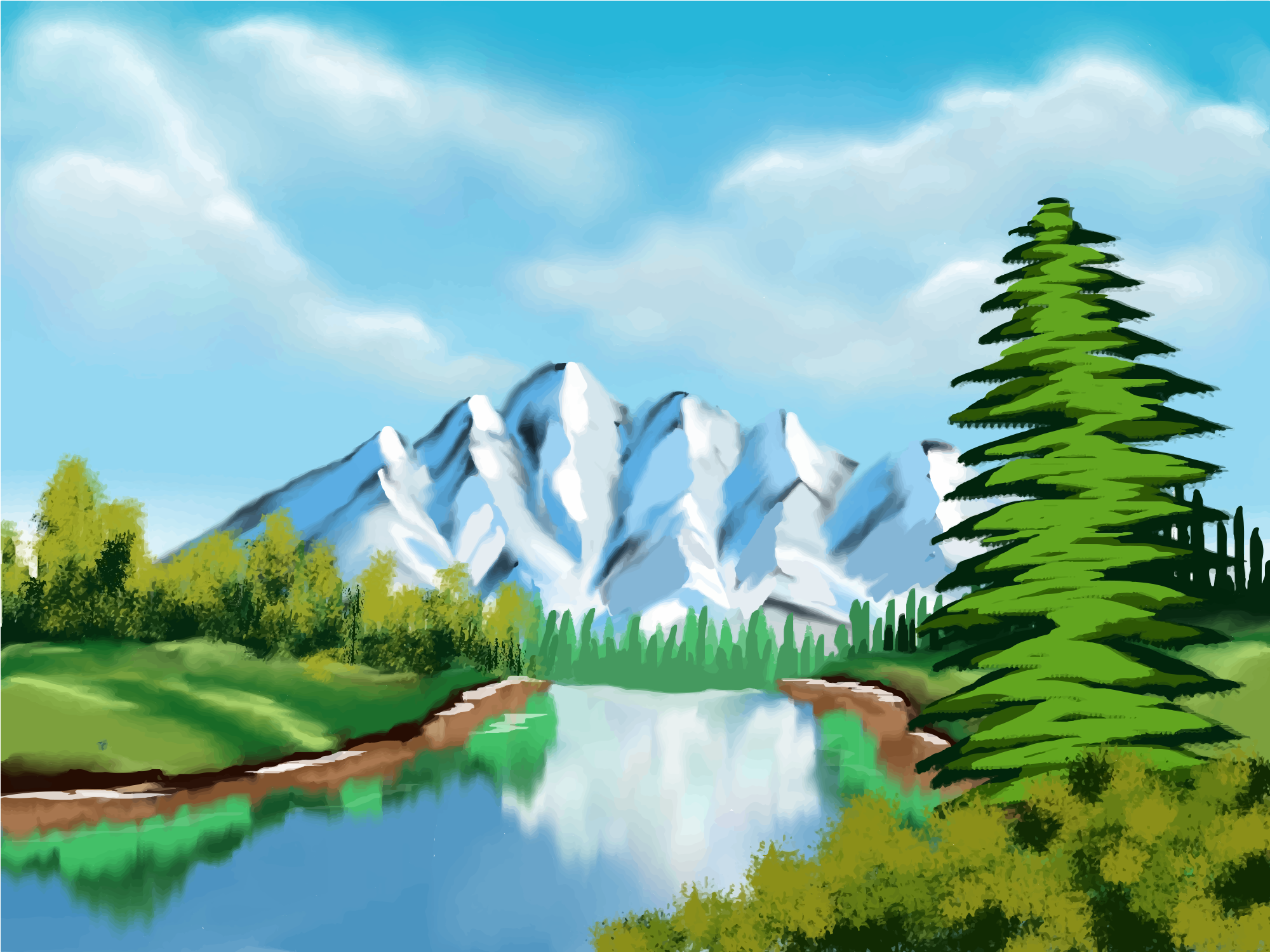 This features a serene landscape with a large mountain in the background, surrounded by trees and water. A pine tree stands prominently near the water's edge, adding to the picturesque scene. The mountain appears to be covered in snow, creating a majestic backdrop for the tranquil setting. The combination of the natural elements, such as the river, mountain, and trees, creates an idyllic atmosphere that evokes feelings of peace and relaxation.