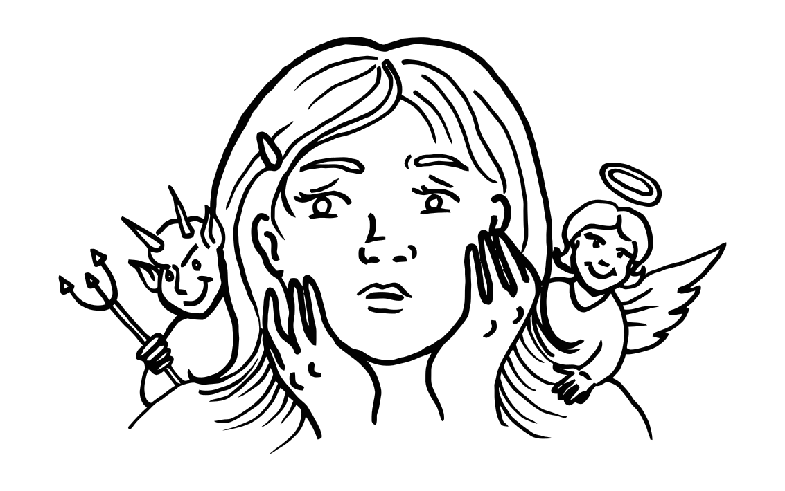This features a woman with her hands on her face, possibly making a funny or surprised expression. She is surrounded by various characters and creatures, including an angel, a devil, and two other people. One of the individuals appears to be a cherub, while another person seems to be a demon. These figures are positioned around the woman in different areas of the image, creating a lively and engaging scene. The combination of these characters adds a unique and interesting visual element to the overall composition.
