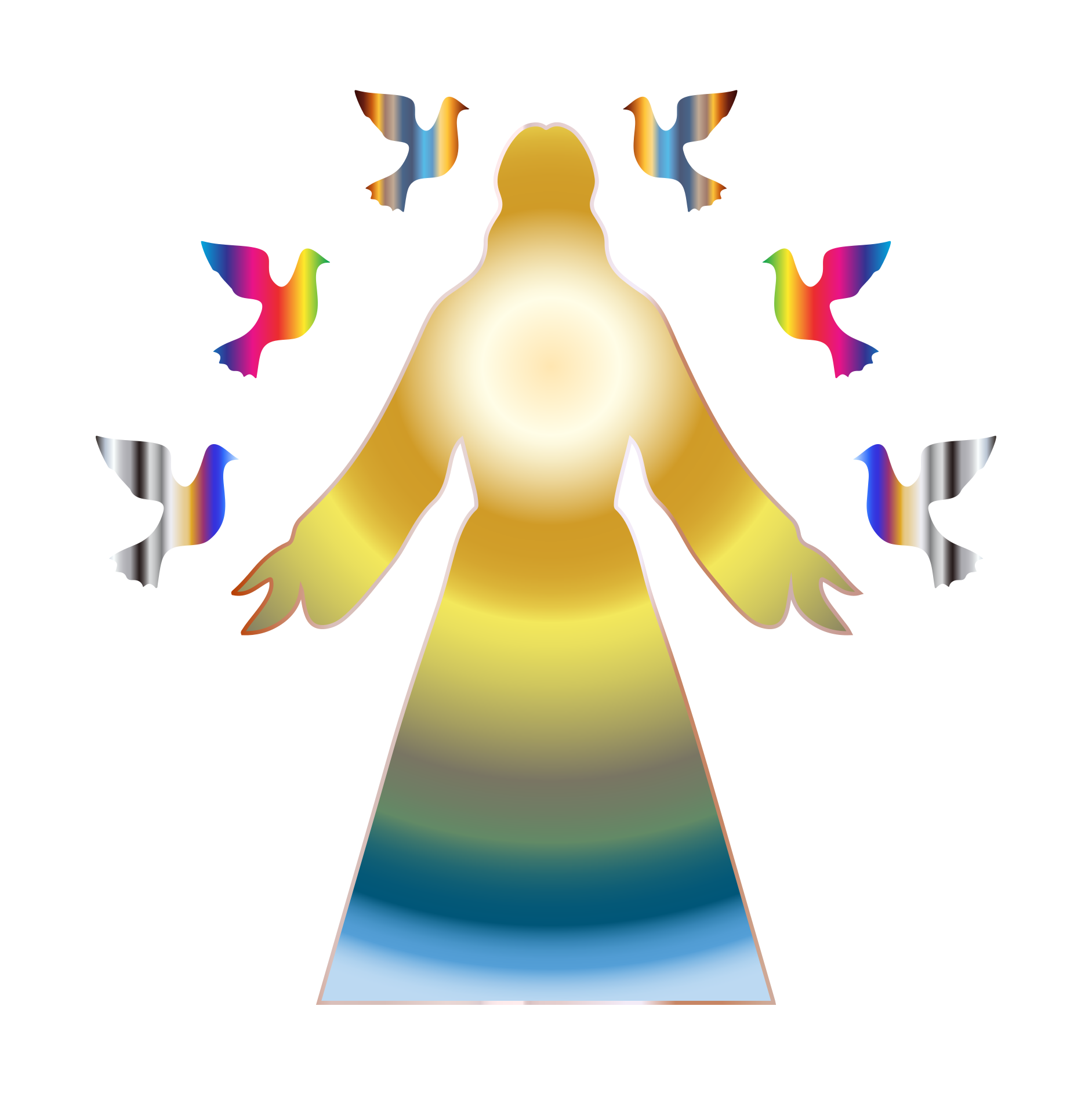 This features a silhouette of Jesus Christ standing with his arms slightly raised. He is surrounded by six doves flying around him, each one glowing with bright colors. The overall scene has a colorful and vibrant appearance, making it visually striking.