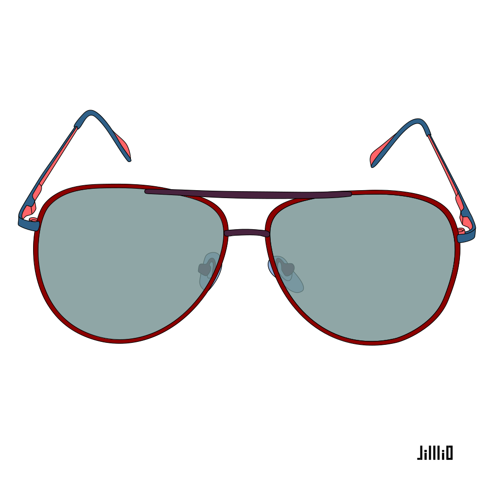 This features a pair of sunglasses with red and blue frames, giving them an old-fashioned appearance. They are open, revealing the lenses inside. The sunglasses have a slightly tinted look to them, adding character to their design. The overall effect is that of a vintage or retro style, reminiscent of classic aviator sunglasses.