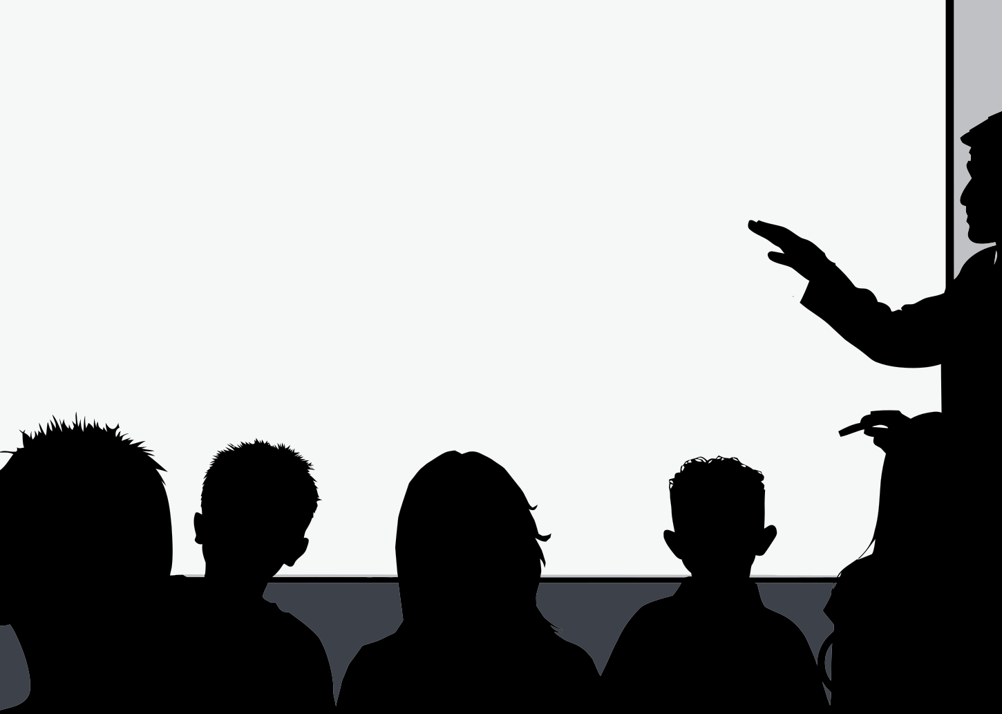 This features a classroom setting with a teacher standing in front of a white screen, giving a lecture to the students. There are several silhouettes of students watching the teacher intently, including one on the left side and another on the right side of the room. In addition to these students, there is also a person sitting at the back of the classroom. The overall atmosphere suggests an educational environment where students are actively engaged in learning from their instructor.