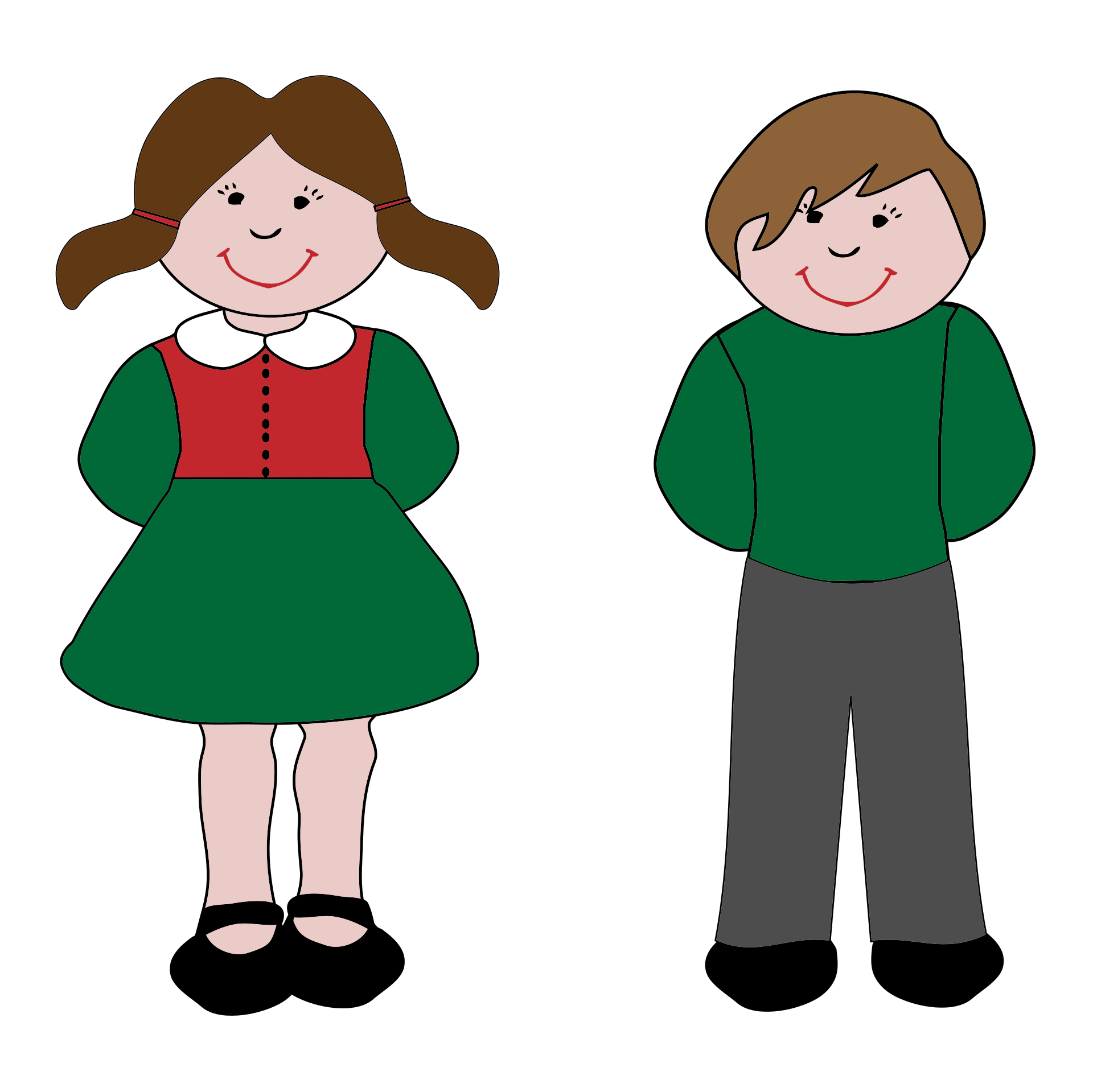 This features two cartoon drawings of a boy and girl standing next to each other. Both characters are wearing green shirts, with the boy's shirt being slightly larger than the girl's. They both have smiles on their faces, indicating that they are happy or enjoying themselves. The boy is positioned more towards the right side of the image, while the girl stands to his left. Their outfits and expressions give a sense of warmth and friendliness in the scene.