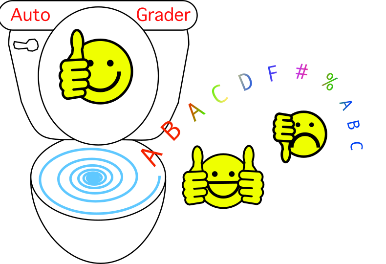 This features a toilet with a yellow smiley face on the lid. Above the toilet, there is a sign that reads "auto grader." This suggests that the toilet might be an automated grading system for some kind of test or exam. In addition to the main toilet, there are several other toilets in the background, each with their own unique features and designs. The overall scene is quite colorful and playful, making it a fun and quirky image.