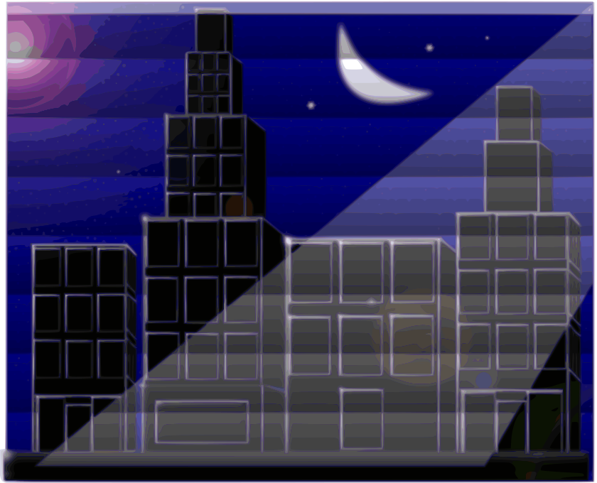 This features a cityscape at night with tall buildings and a moon in the sky. The buildings are black, giving them an urban feel. A spotlight is shining over some of the buildings, highlighting their architectural details. The scene captures the essence of a bustling city during nighttime hours, with the moon providing a serene backdrop to the illuminated structures.