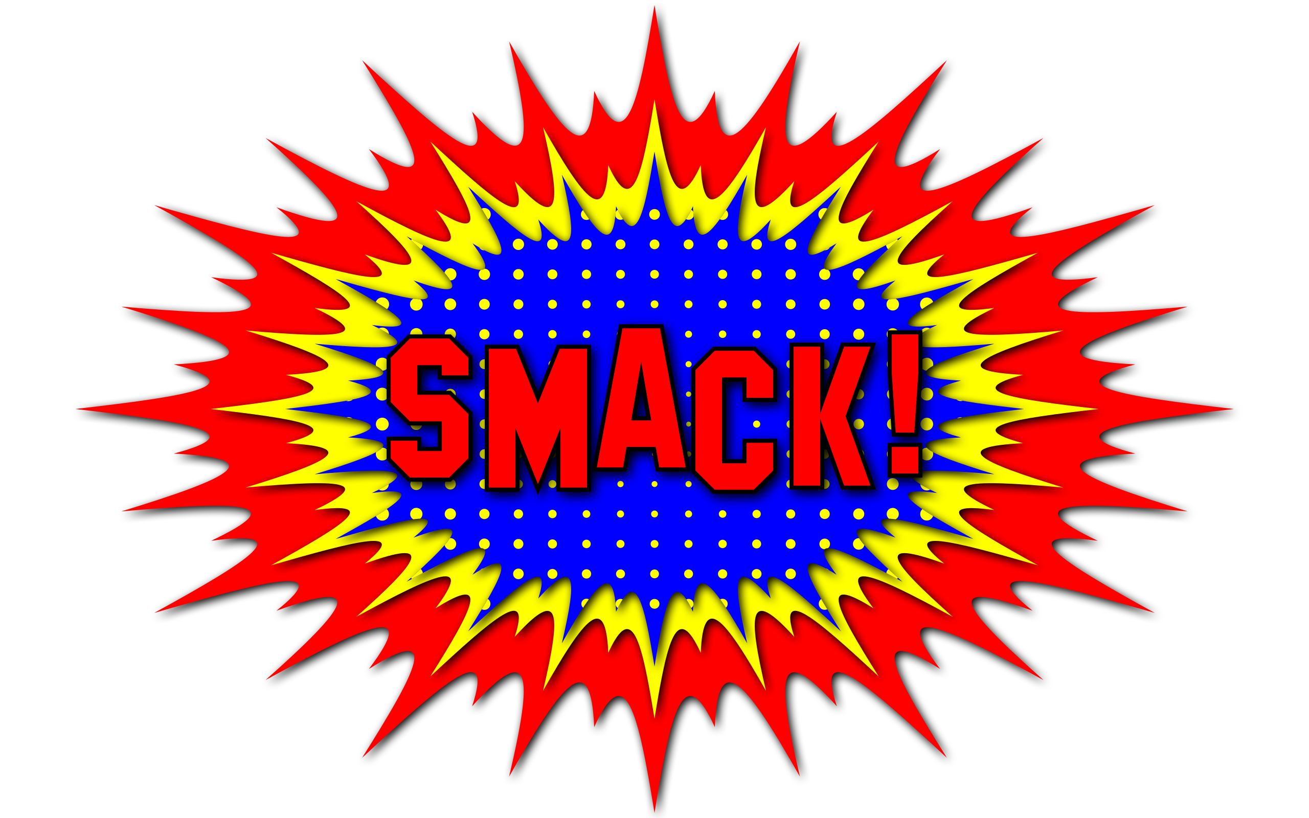 This features a red and blue explosion with the word "SMACK!" written in white letters. The explosion is located at the center of the image, surrounded by yellow and red colors that extend outwards from it. This iconic symbol represents an action or reaction to something unexpected or surprising, often used as a playful exclamation.